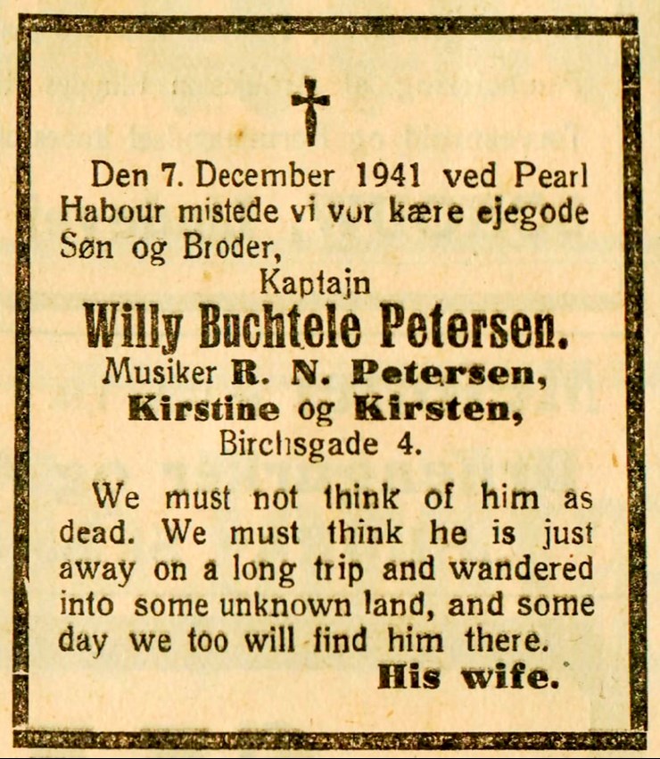 Dødsannoncen for krigssejleren Willy Buchtele Petersen bragt af hans forældre i Kalundborg Folkeblad. Selv kaldte han sig for Bill Buchtele.
