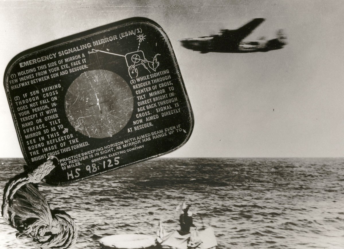 En amerikansk flyvemaskine flyver over en flåde med overlevende fra det forliste skib Panama. Foto: M/S Museet for Søfart. Fotograf Thomas Wood.