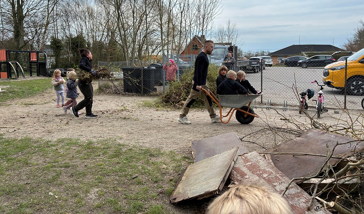 Der blev fældet træer, klippet ned og gjort grundigt forårsrent i alle kroge af legepladsen. Derudover blev der sat nye net i fodboldmålene, og der blev kørt mange læs til genbrugspladsen.