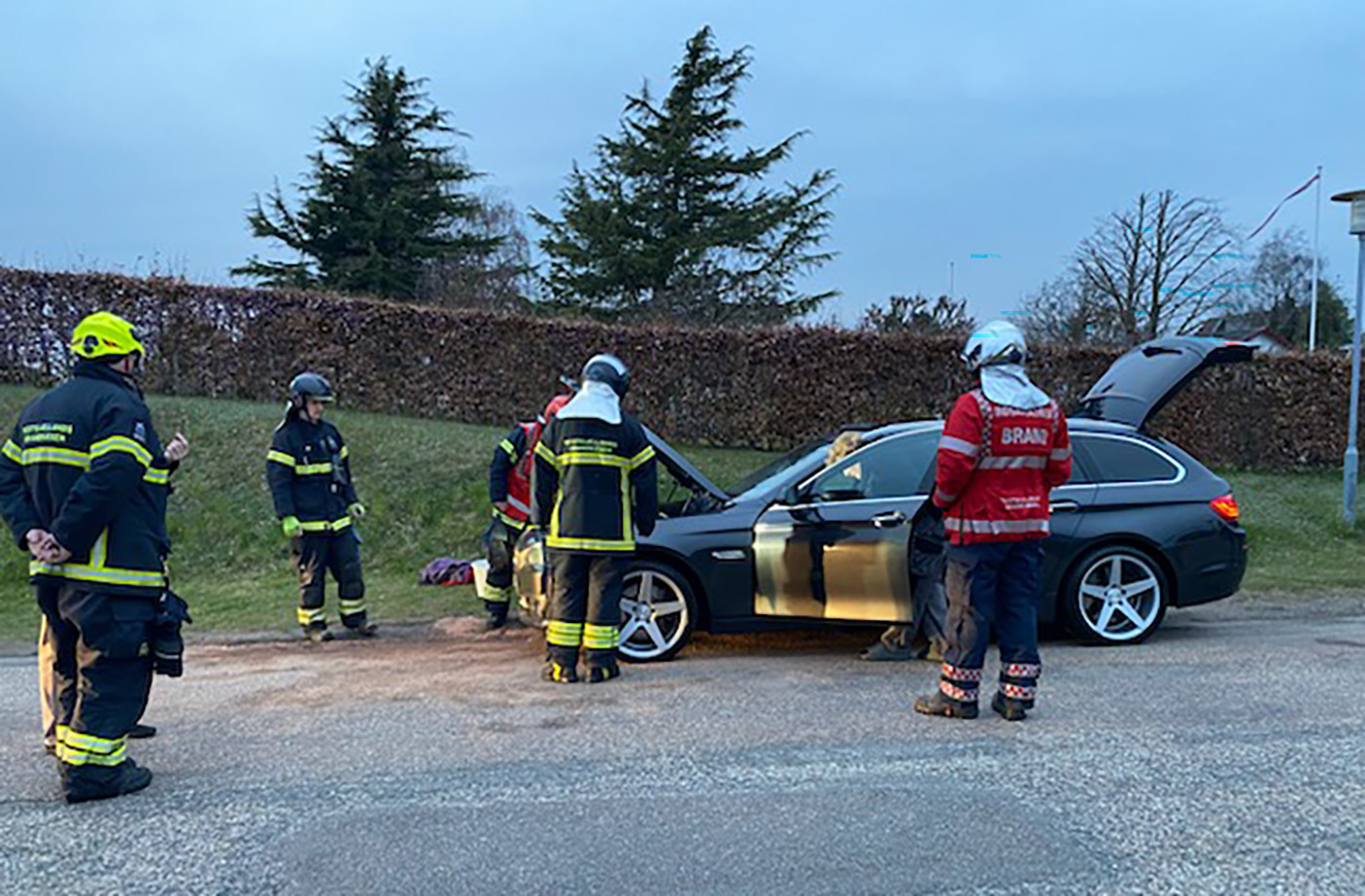Brand i bil, som står i det fri