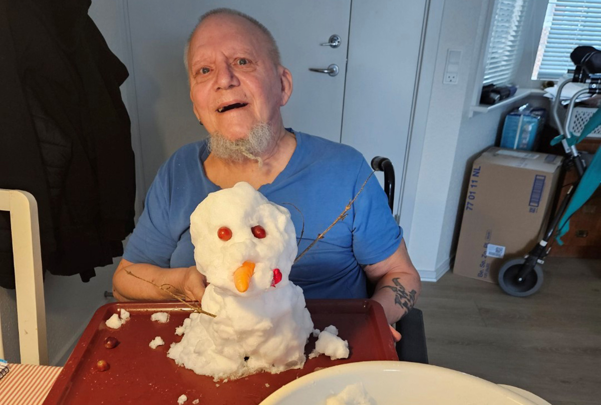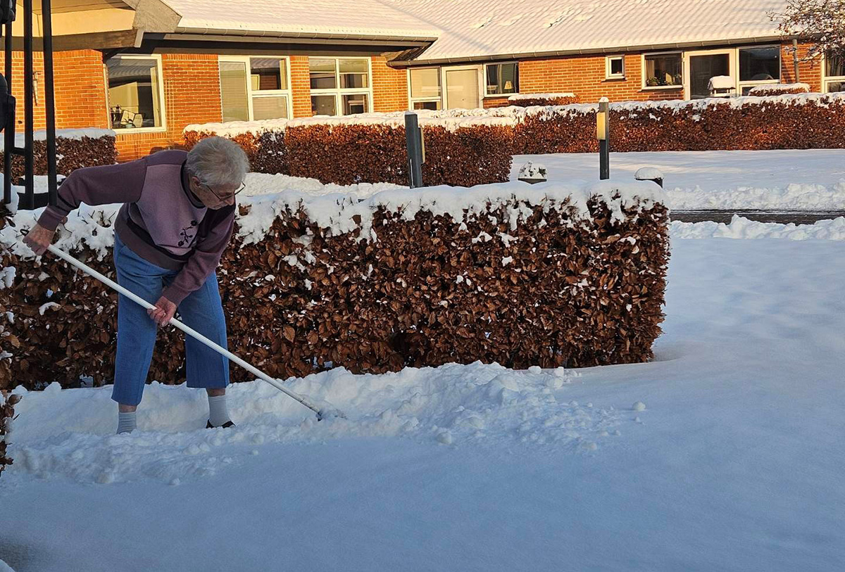 Selv inden døre blev vinterstemningen bragt helt tæt på, da Jan fik lov til at bygge en snemand – ganske vist indendørs, men med lige så stor begejstring. Og udenfor viste 100-årige Hansa, at alderen ikke sætter grænser for lysten til frisk luft, da hun helt af egen fri vilje tog fat på sneskovlen og ryddede lidt sne.
