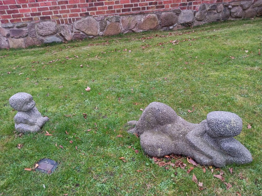 Jens Blochs granitskulptur af mor og barn på græsarealet foran kirken lytter helt tydeligt til musikken fra oven. Privatfoto