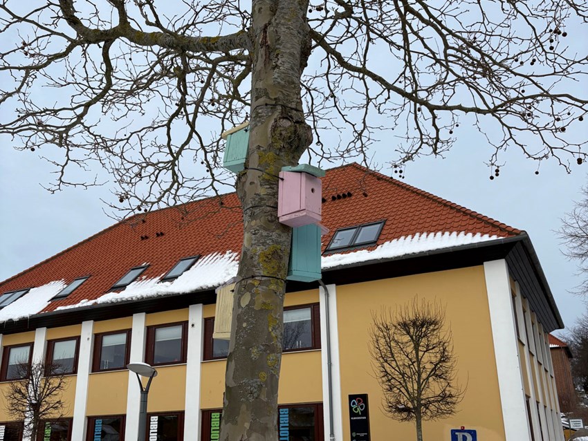 Et antal redekasser er sat op i træerne på Klostertorvet, fint malede i pastelfarver, og de venter bare på, at fuglene flytter ind.