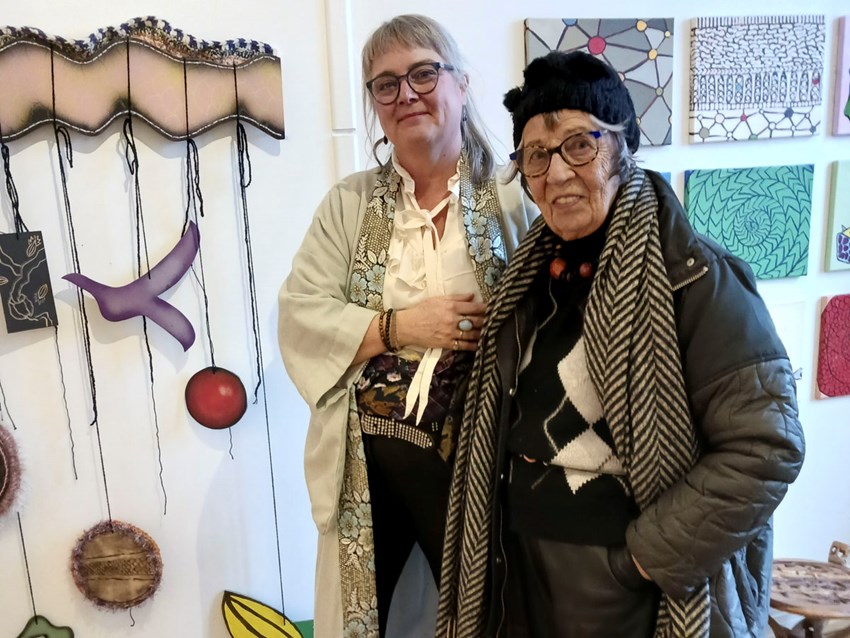 Aina fik besøg af sin gode veninde, kunstneren Grete Balle, der har set Ainas værker på blandt andet Galleri Krebsen i København. Foto: Sonja Husted