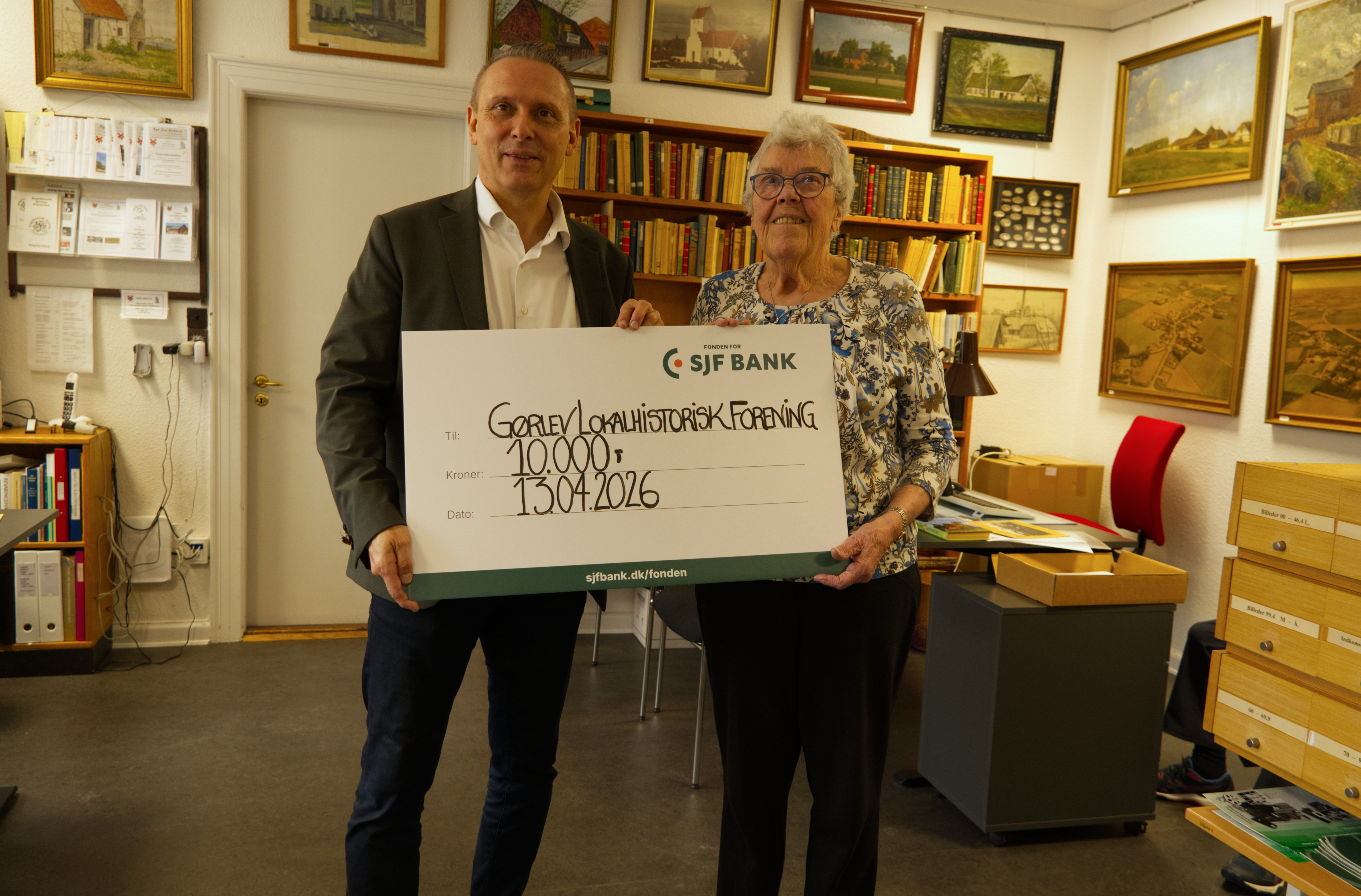 Omkring 127.000 kroner kommer det til at koste at udgive bogen, og derfor var det med stor begejstring, at man i går mandag tog imod Klaus Koksby Hansen fra Fonden SJF Bank, der havde en check på ikke mindre end 10.000 kroner med til bogudgivelsen.