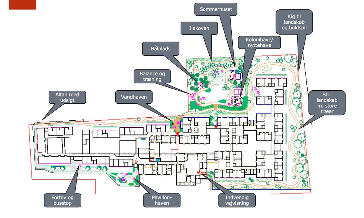 Demensbyen bliver et aktivt miljø med traditionelle haveoplevelser som rislende vand i vandhaven, muligheden for at sidde under duftende roser og kaprifolier i pergolaen eller hygge på musik-pladsen med gyngesofaer og velkendte stauder fra barndommen.