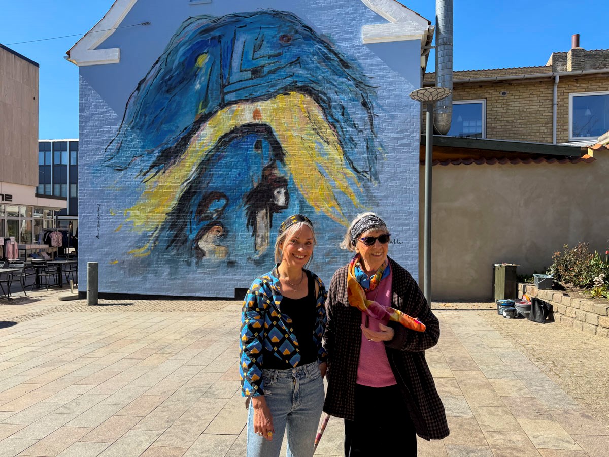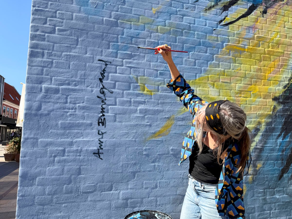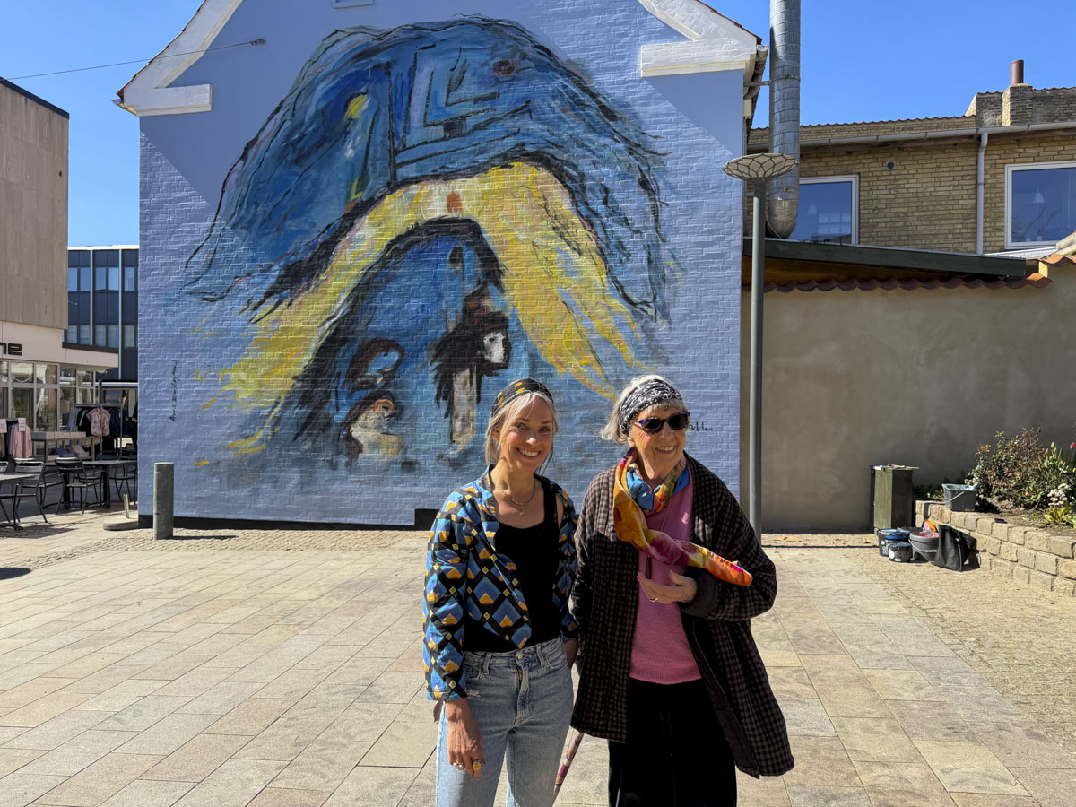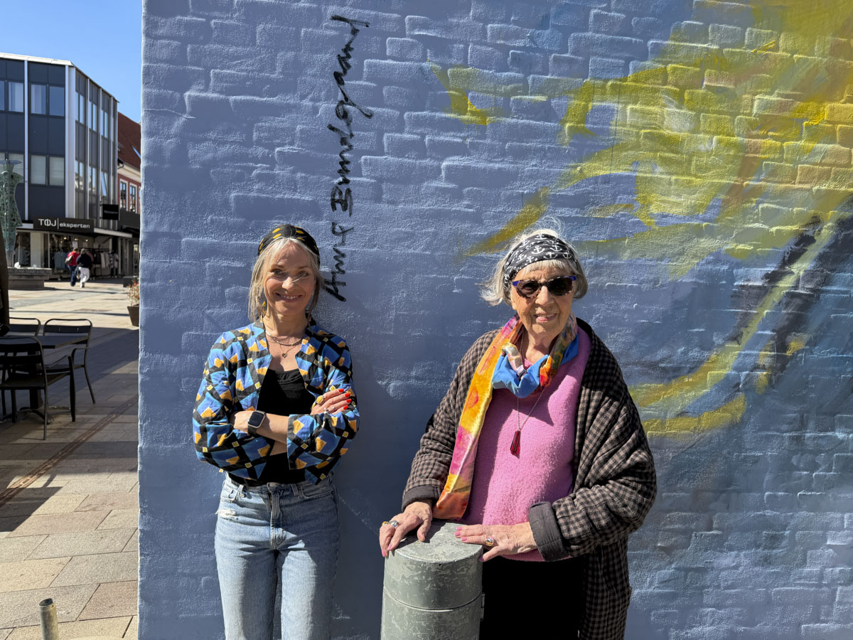 Det er to uger siden, de første streger til Grete Balles gavlmaleri blev sat af Anne Bundgaard. Torsdag eftermiddag blev værket fuldendt med de to kunstneres signaturer.