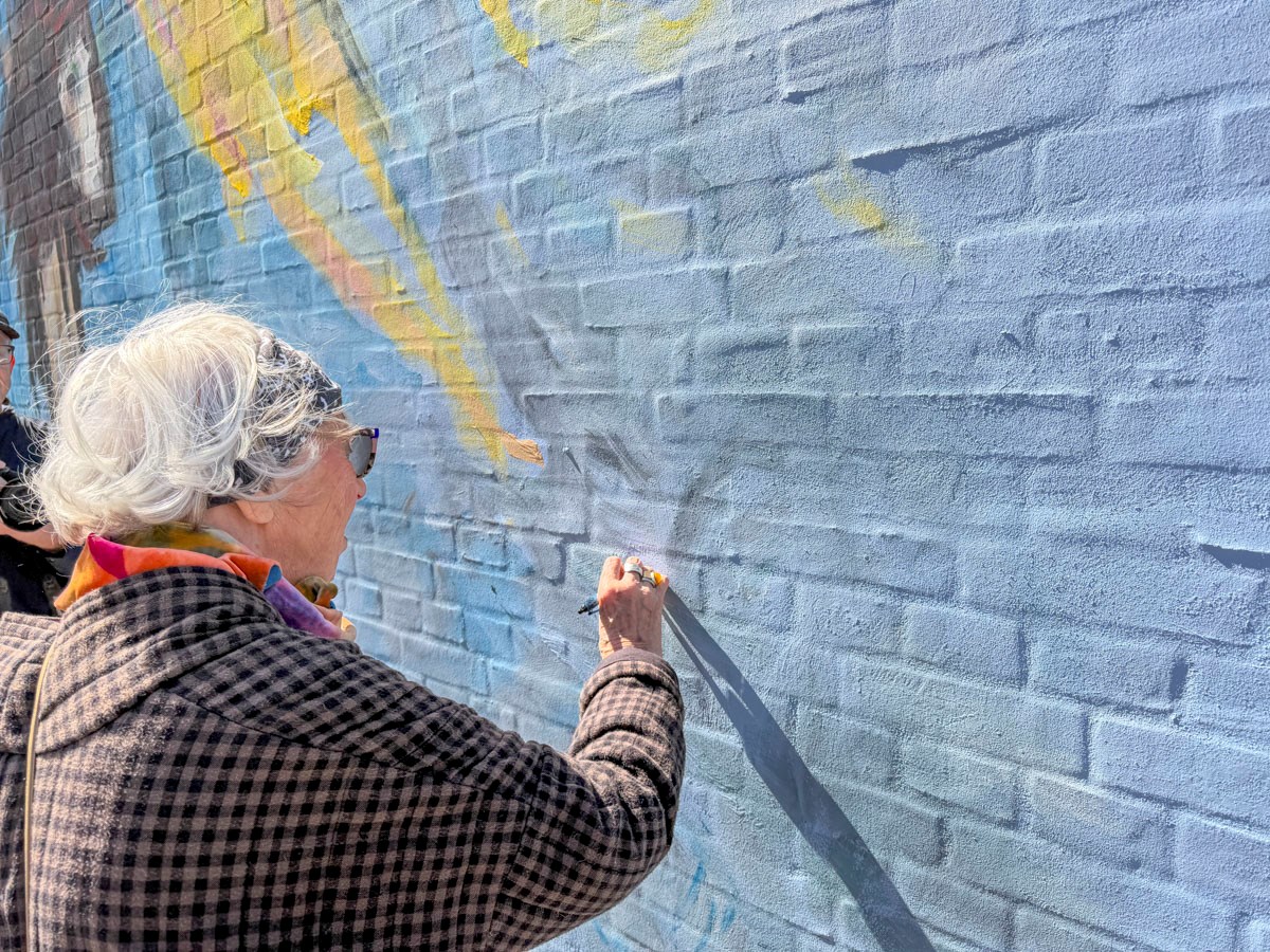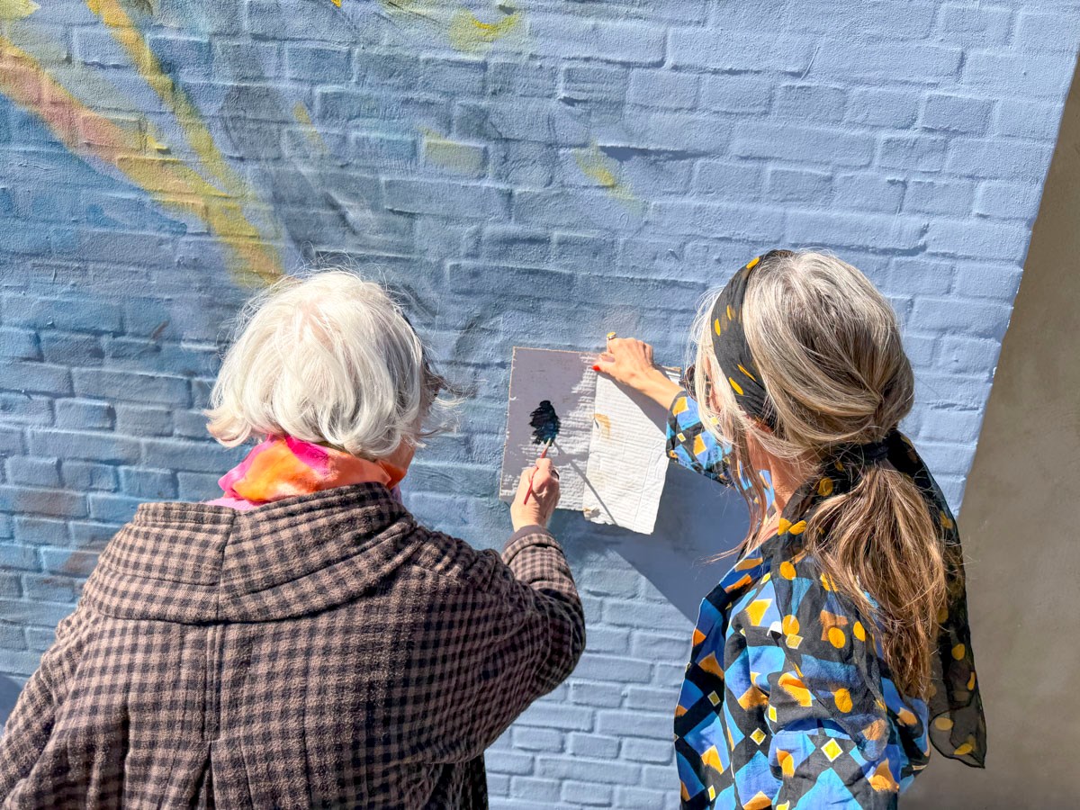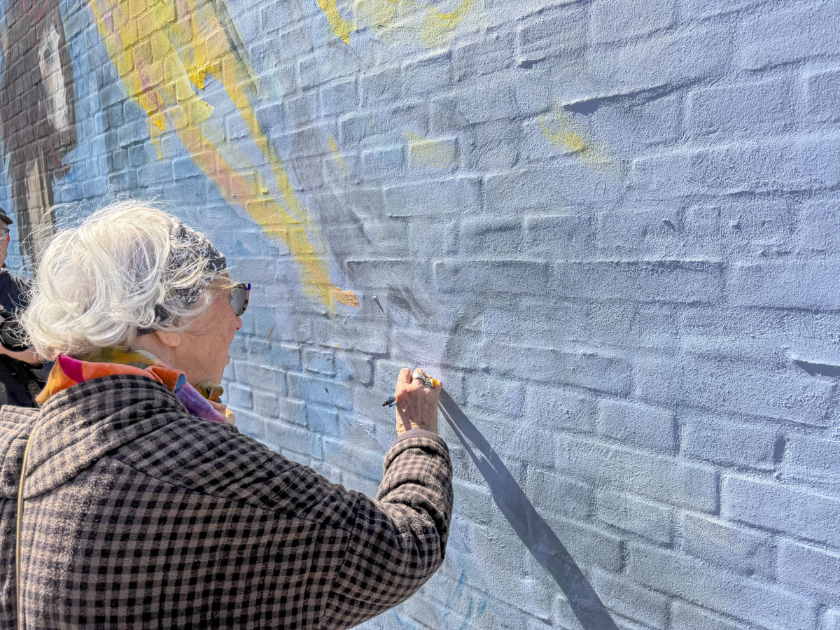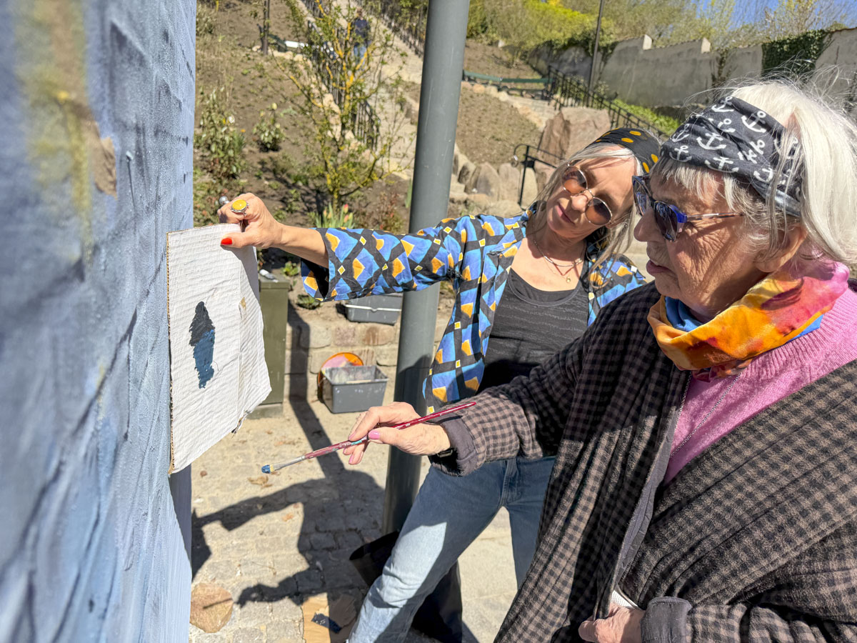 Det er to uger siden, de første streger til Grete Balles gavlmaleri blev sat af Anne Bundgaard. Torsdag eftermiddag blev værket fuldendt med de to kunstneres signaturer.