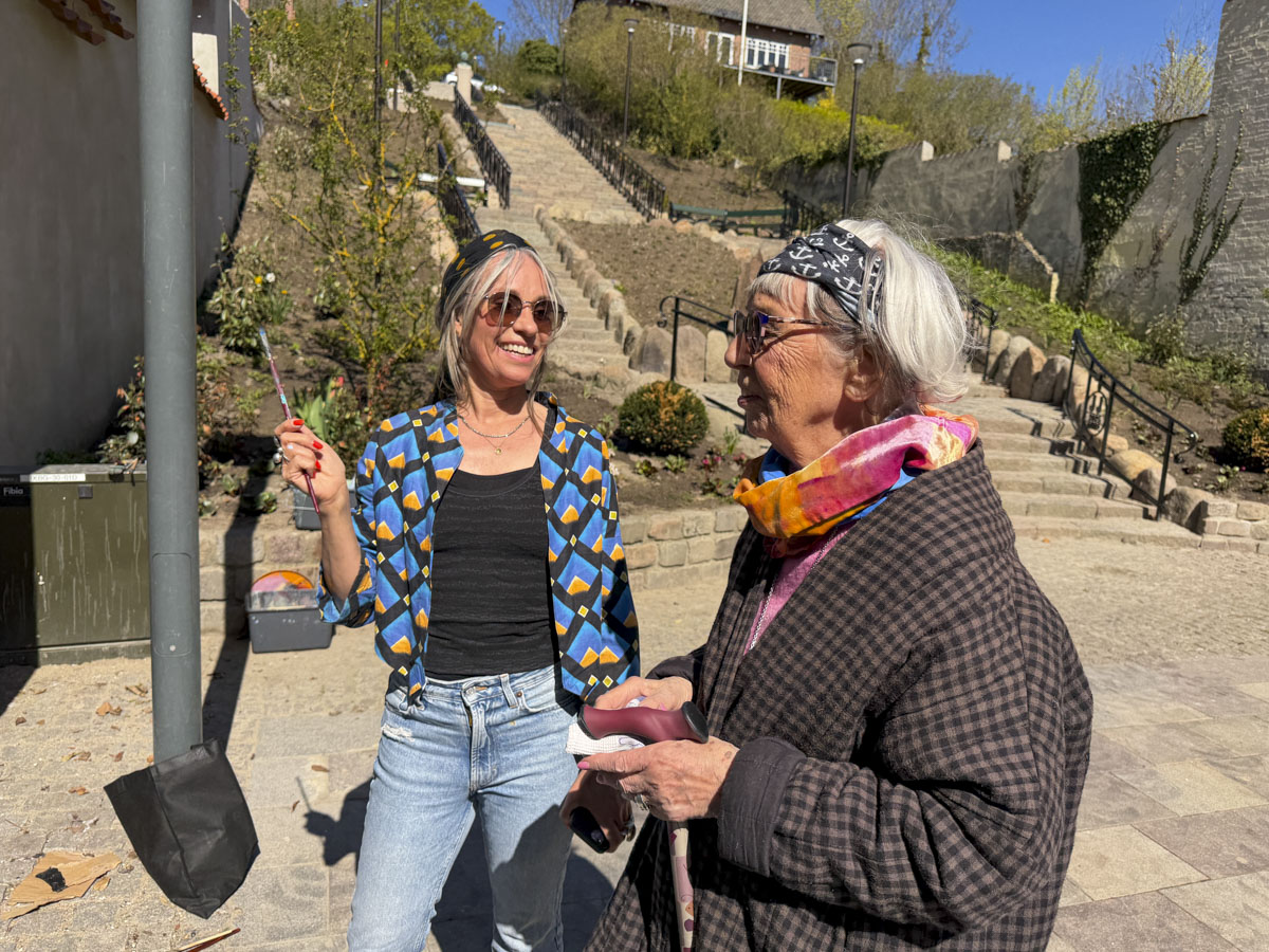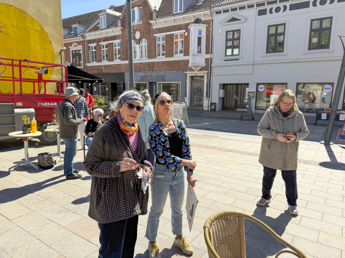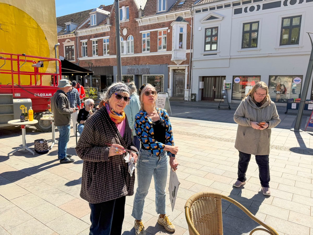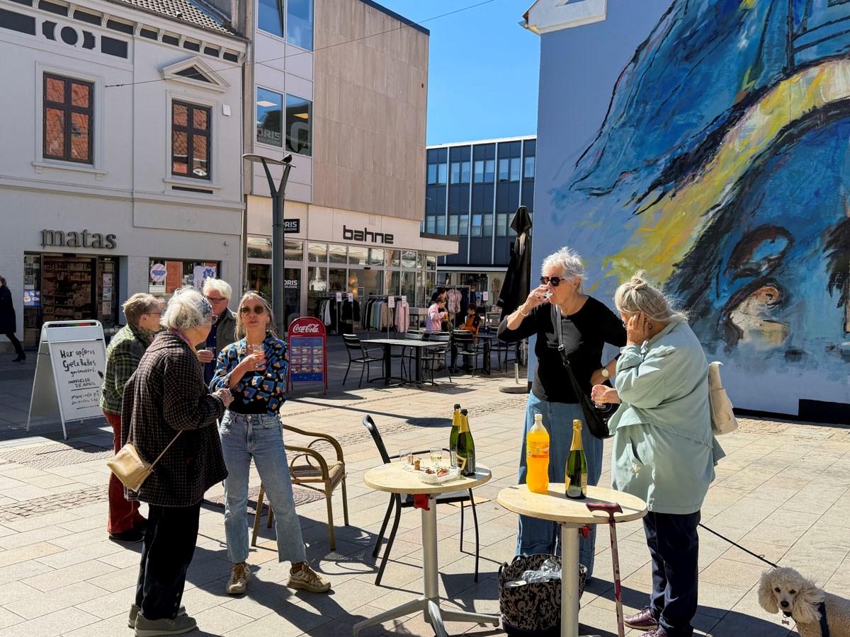 Kalundborg Forskønnelsesforening havde i den anledning sørget for lidt bobler, og mens Grete Balle og Anne Bundgaard satte deres signaturer på gavlen, sivede nysgerrige frem på pladsen og kiggede med.