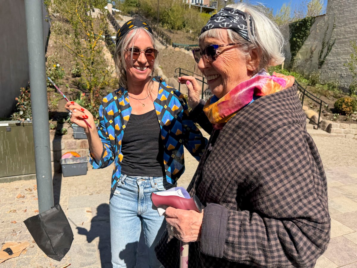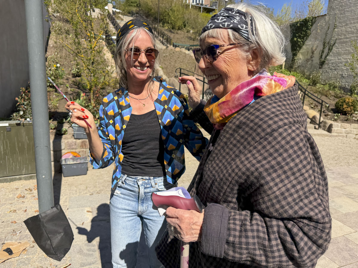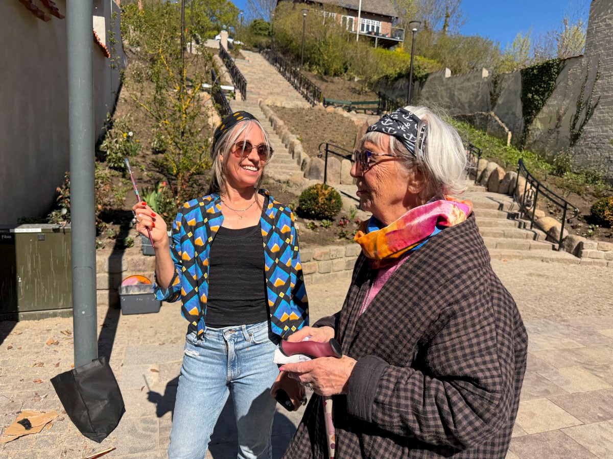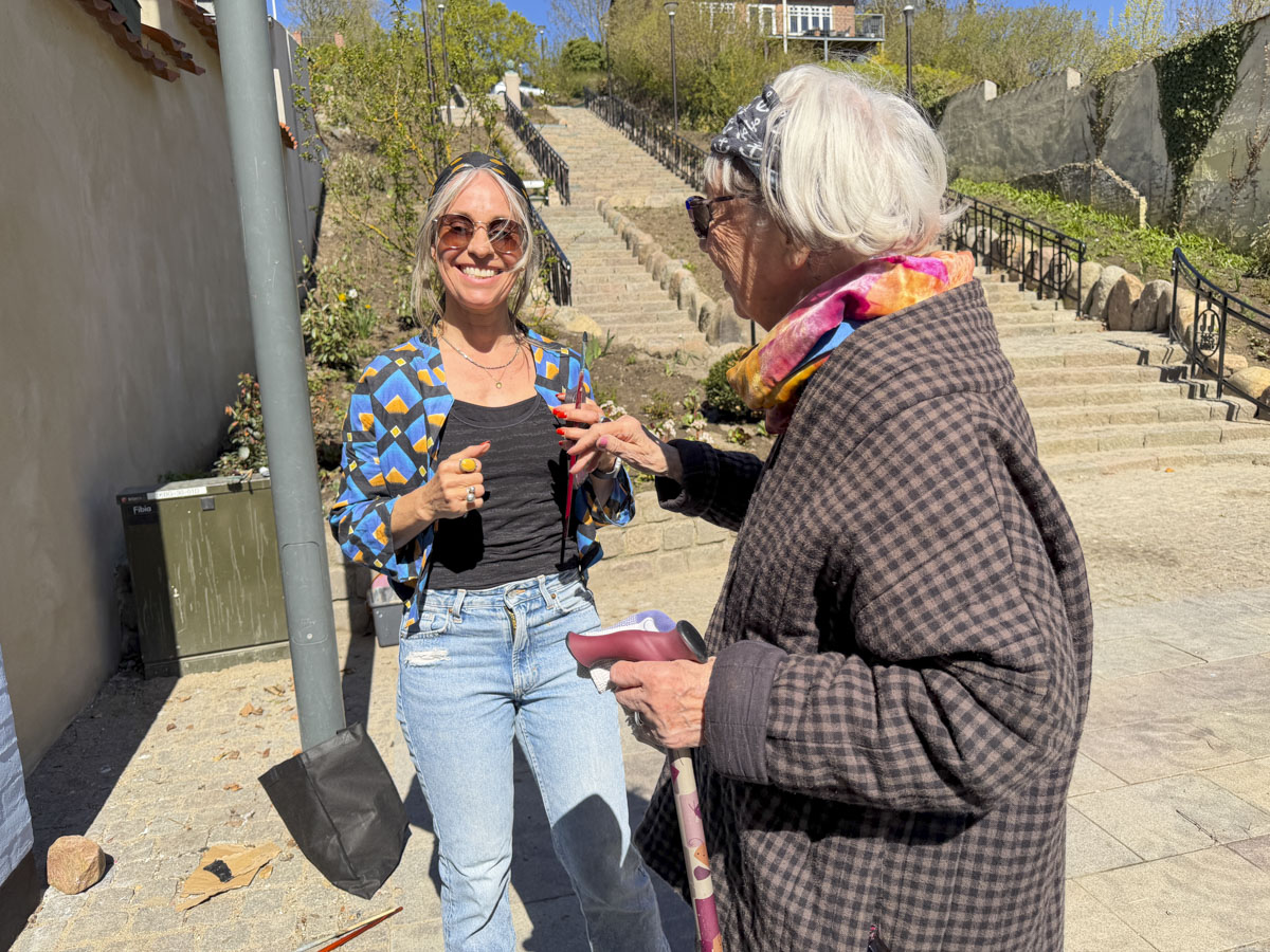 Kalundborg Forskønnelsesforening havde i den anledning sørget for lidt bobler, og mens Grete Balle og Anne Bundgaard satte deres signaturer på gavlen, sivede nysgerrige frem på pladsen og kiggede med.