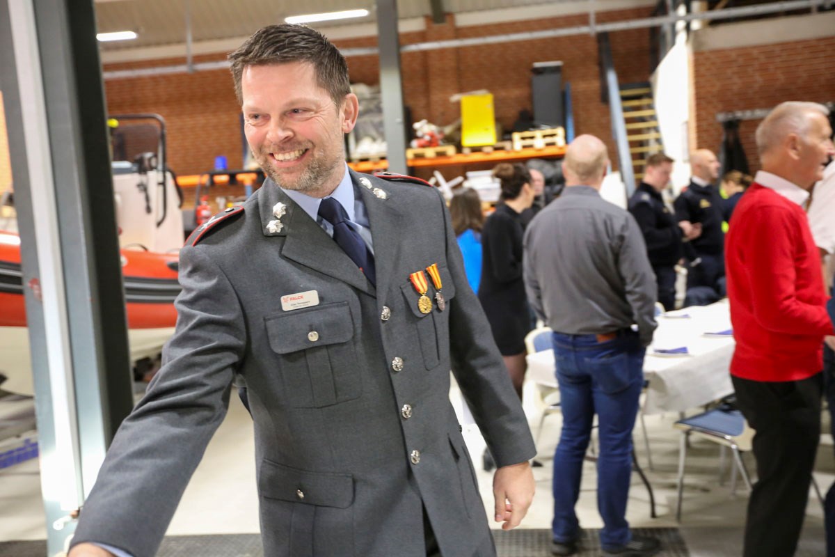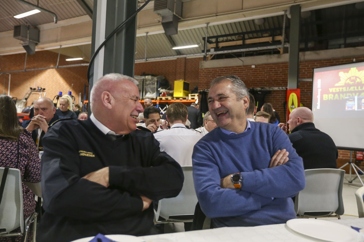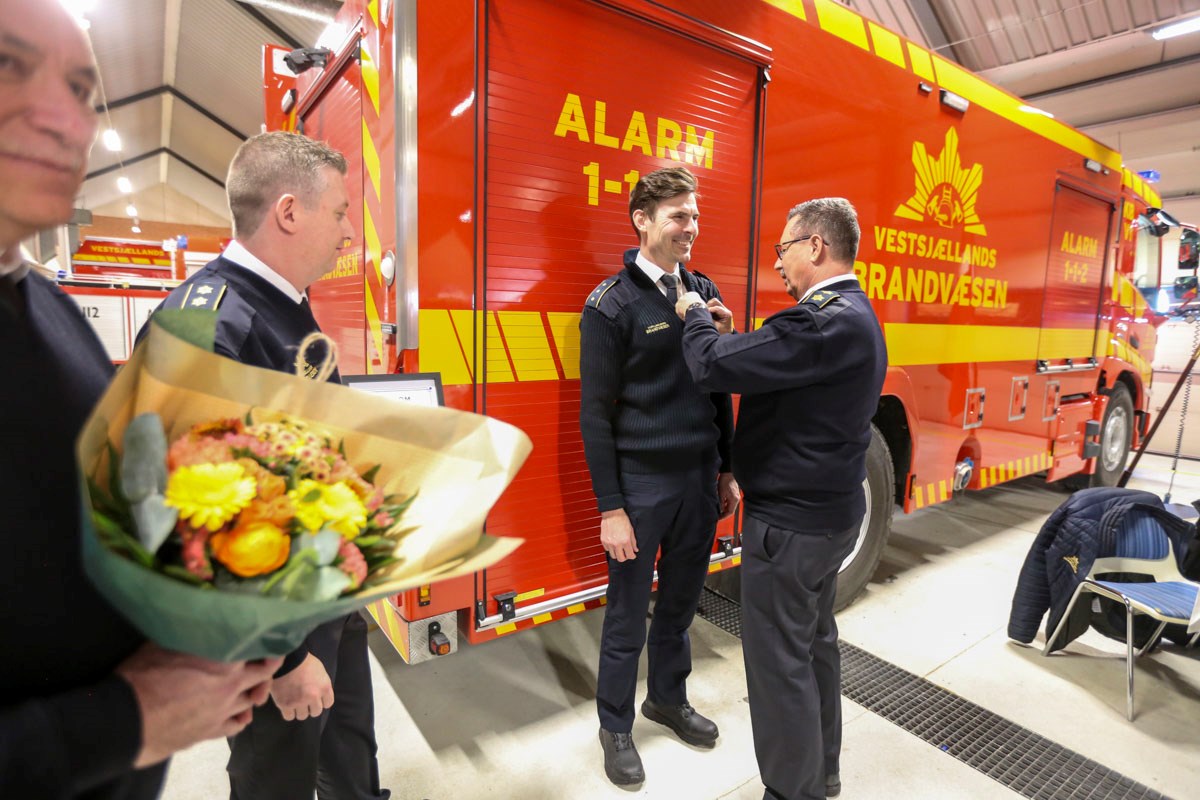 Inden der var fri snak og hygge, skulle der uddeles en nål. Den gik til Thomas Holm, der har været 10 år i Vestsjællands Brandvæsen. Den fik han sat på sin trøje af Lars Karlsen.