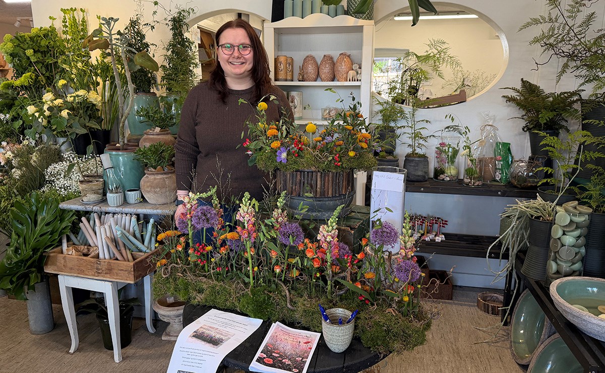 20-årig Freja Christiansen er elev i Den Lille Blomsterbutik, som ejes af Charlotte Rasmussen. Hun er færdig som blomsterdekoratør til sommer, og er lige nu i gang med en opgave, hvor hun har valgt at se på begravelser/bisættelser på en mere moderne måde.