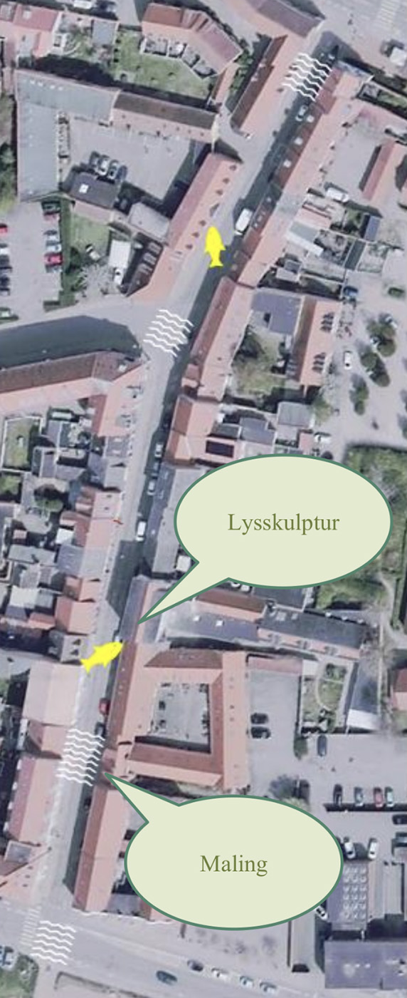 Det kan ofte være svært for besøgende i Kalundborg at finde rundt mellem byens gode steder. Samtidig kan den nedre del af Skibbrogade godt virke lidt skummel om aftenen. Lysskulpturen bliver et landmark i gaden, som sammen med bemaling på asfalten skal være med til at gøre gaden mere hyggelig og gøre det lettere at finde vej. Lysskulpturen ønskes placeret i den nedre del af Skibbrogade, så den kan ses både fra den øvre del af Skibbrogade og fra Havneparken både i dagslys og i mørke. Lysskulpturen tænkes udført som en fisk, der elegant svæver gennem gaden ophængt i wirer ligesom gadebelysningen.