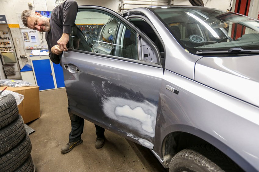"Jeg har nogle forskellige værktøjer til at rette buler ud med, og så sliber og spartler jeg, så autolakereren kan male bilen," forklarer Michael Jørgensen, der netop er i gang med at rette en bule op i en fordør.