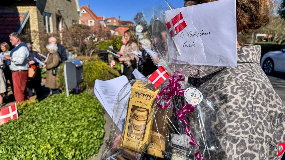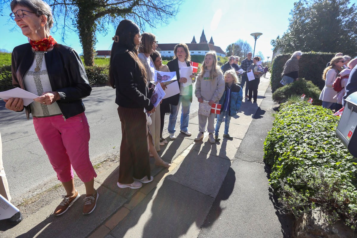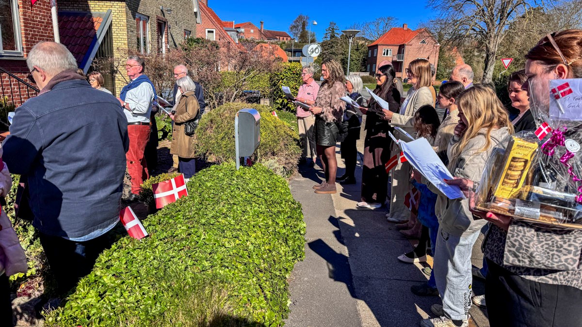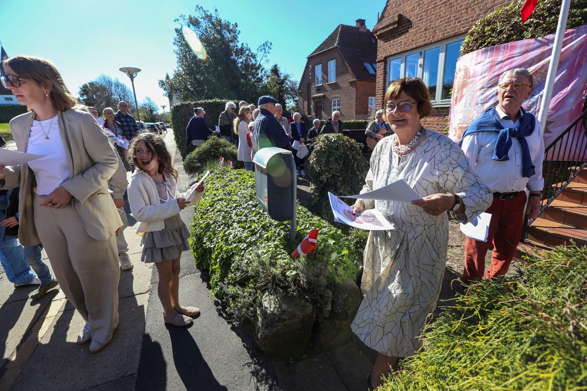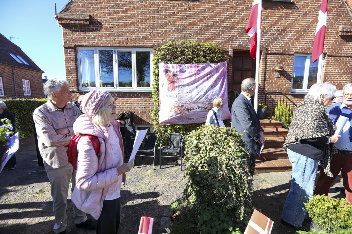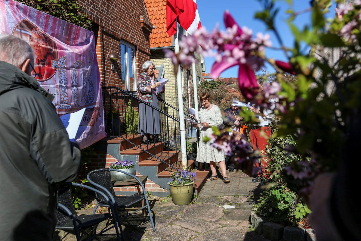 Et banner var hængt op foran huset, og med strålende sol og Vor Frue Kirke i ryggen fik Annemarie Balle sin mor ud på trappen klokken 10, hvor hun først blev mødt af fødselsdagssangen og siden en håndfuld af hendes yndlingssange.