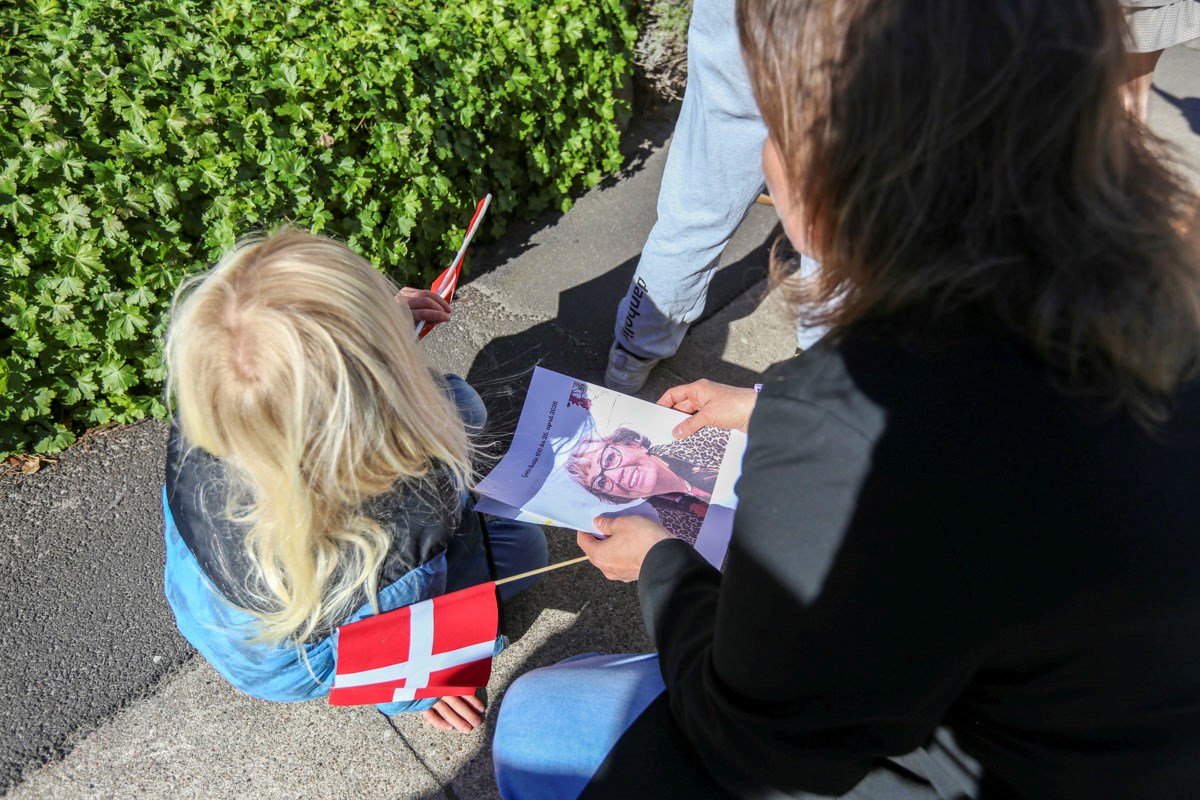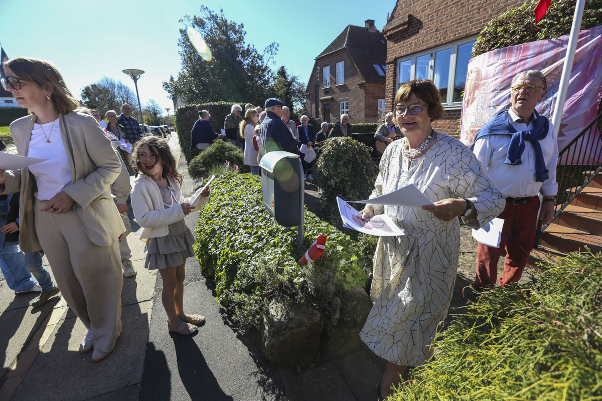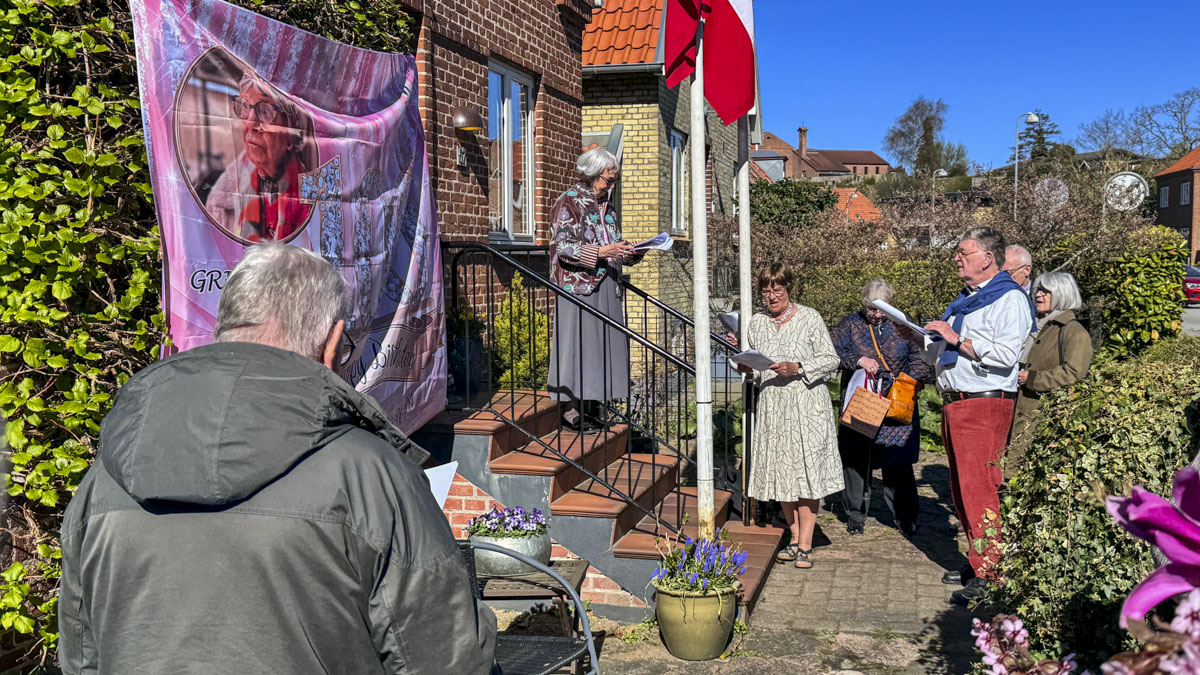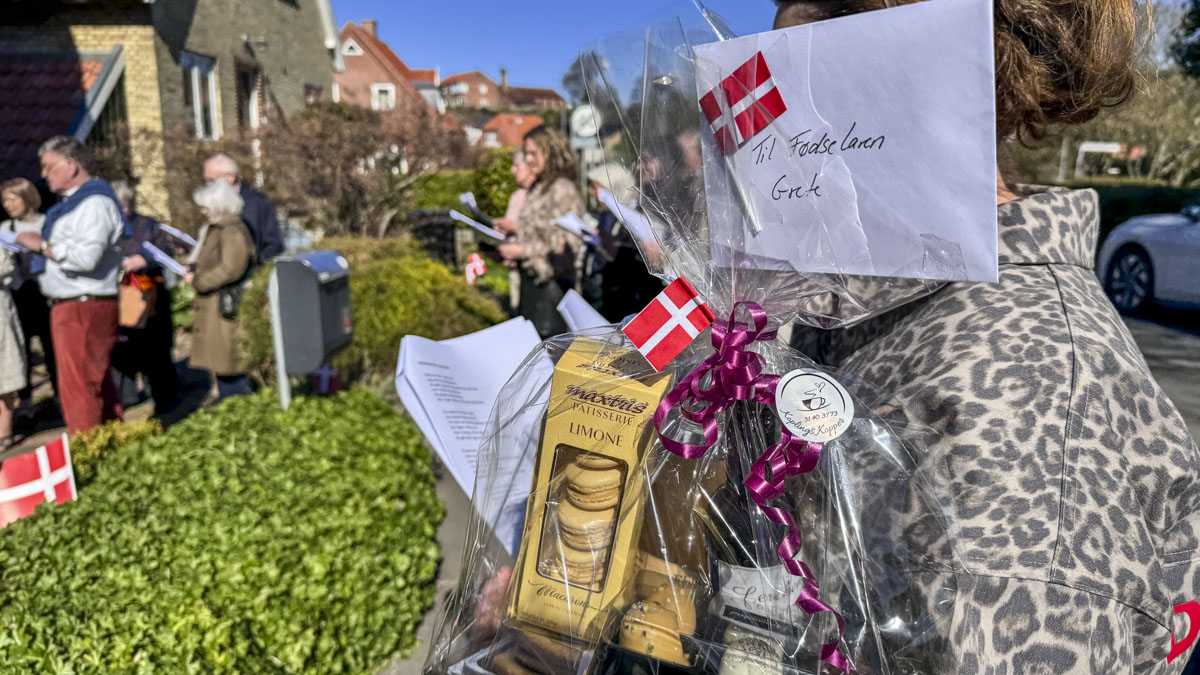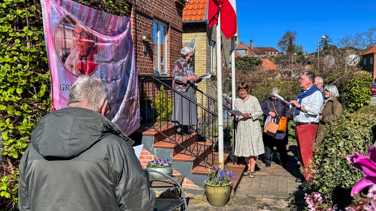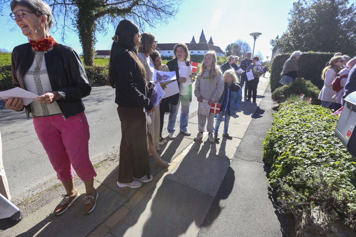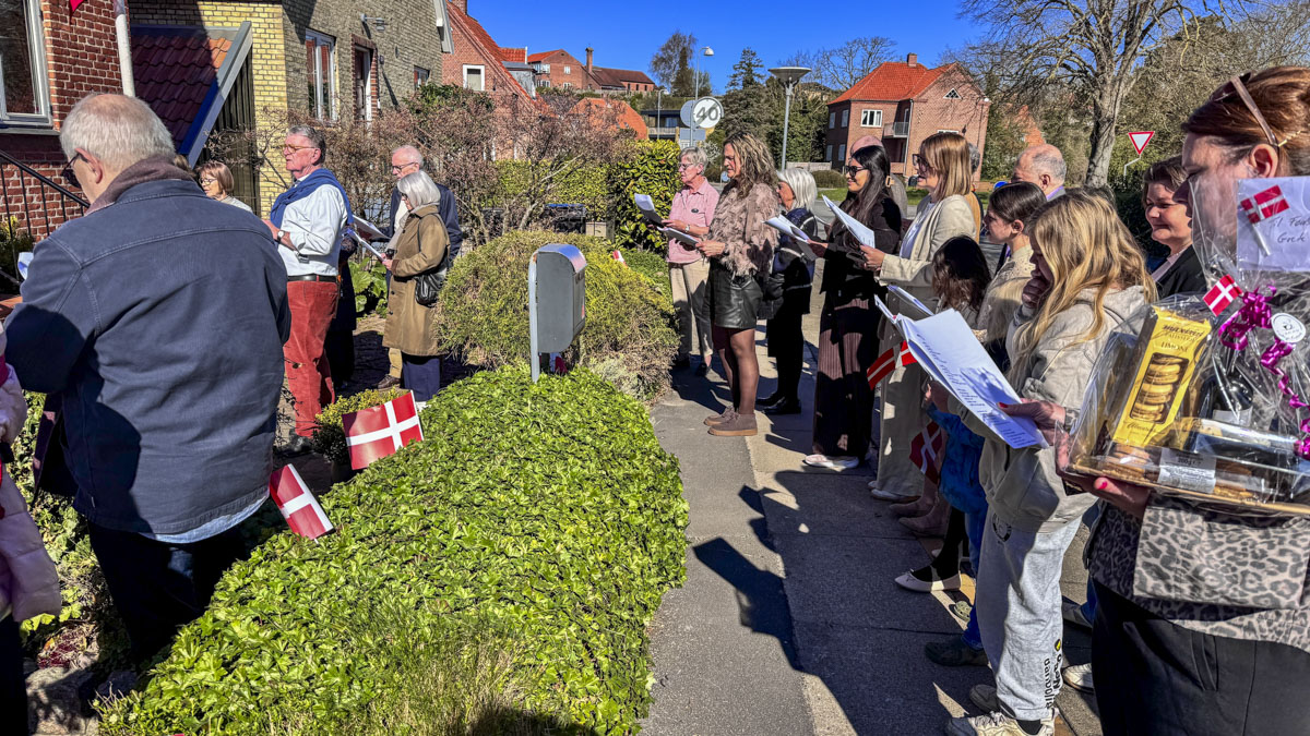 Et banner var hængt op foran huset, og med strålende sol og Vor Frue Kirke i ryggen fik Annemarie Balle sin mor ud på trappen klokken 10, hvor hun først blev mødt af fødselsdagssangen og siden en håndfuld af hendes yndlingssange.
