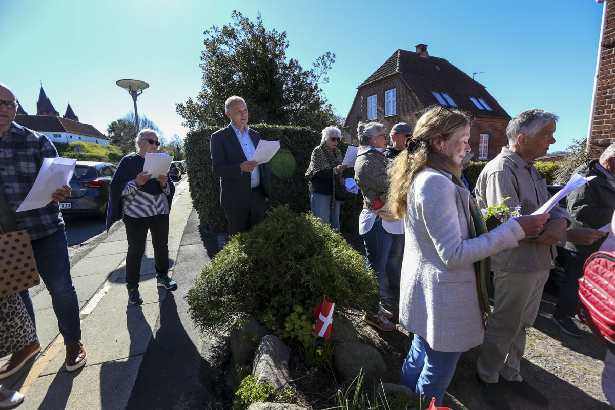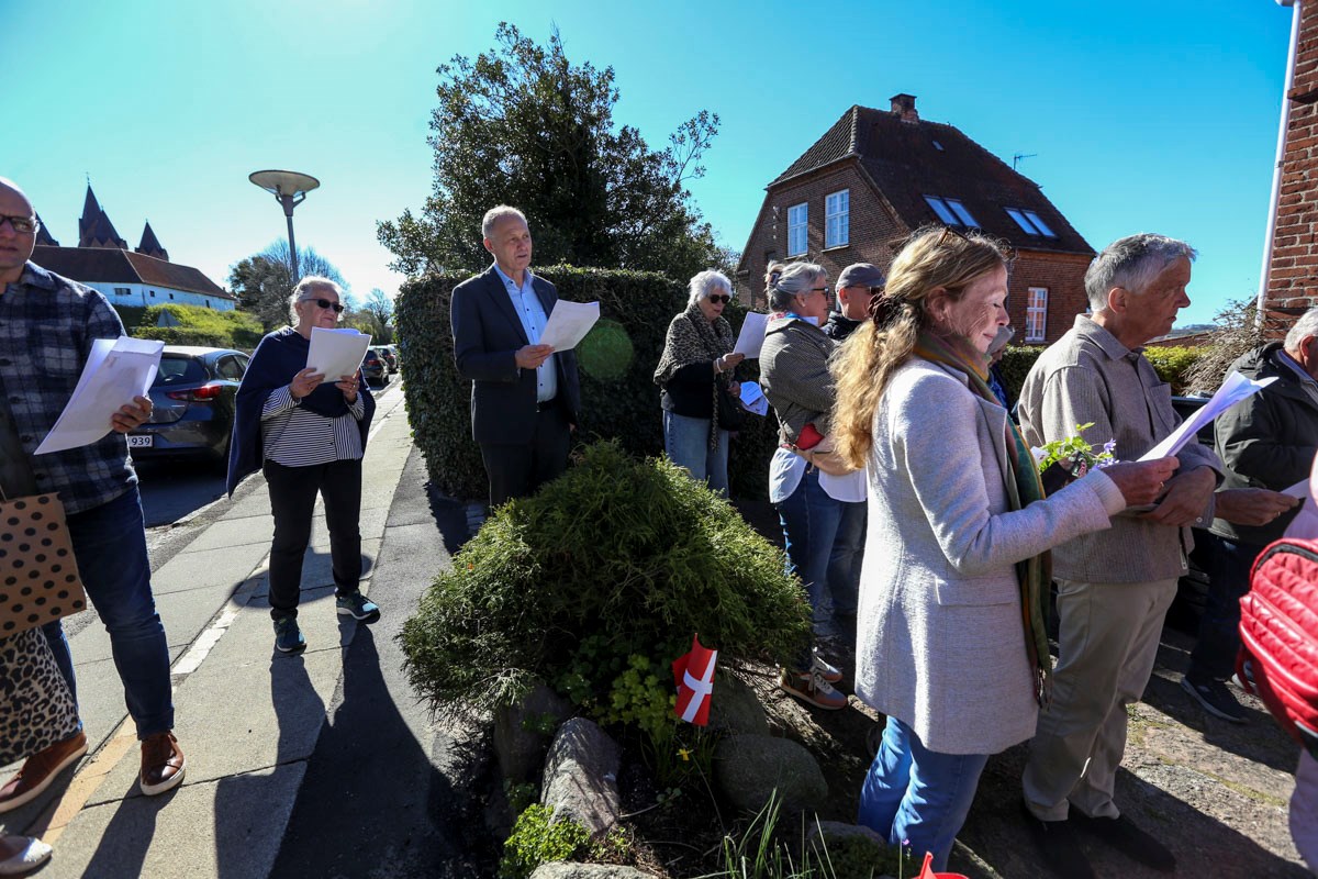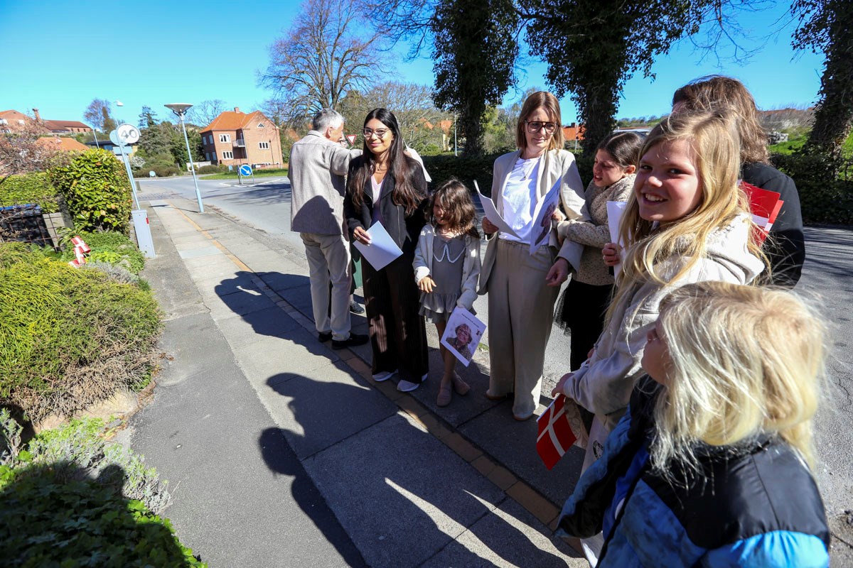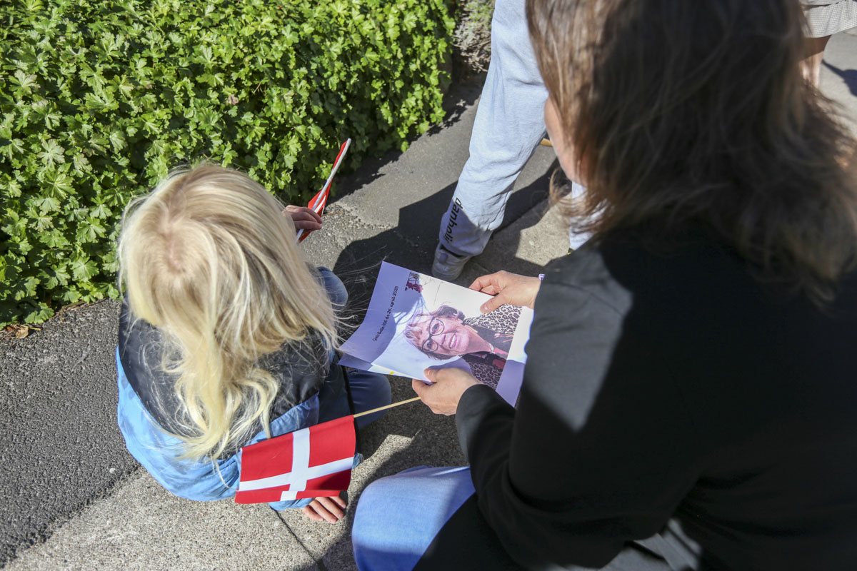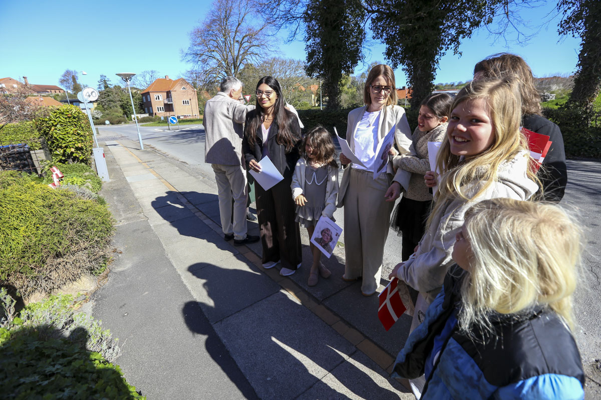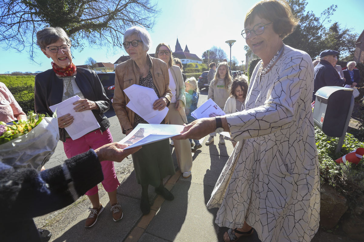 Et banner var hængt op foran huset, og med strålende sol og Vor Frue Kirke i ryggen fik Annemarie Balle sin mor ud på trappen klokken 10, hvor hun først blev mødt af fødselsdagssangen og siden en håndfuld af hendes yndlingssange.