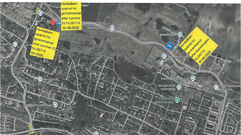 Kalundborg Forsyning skal lægge fjernvarmerør til de nye bebyggelser på Herredsåsen. Det betyder, at Herredsåsen bliver spærret for trafik fra Hestehavebakken i vest frem til Bakketoppen i øst.