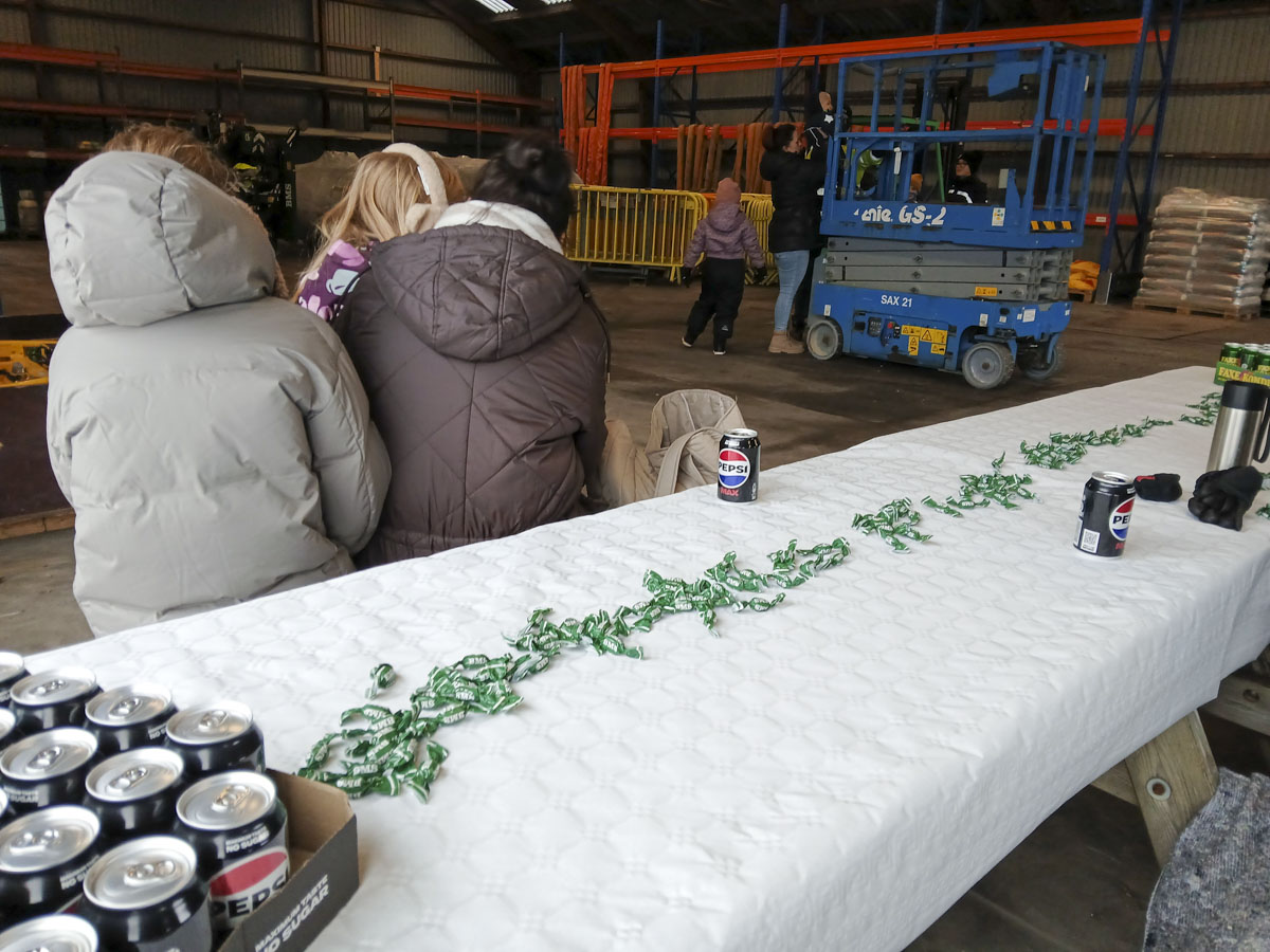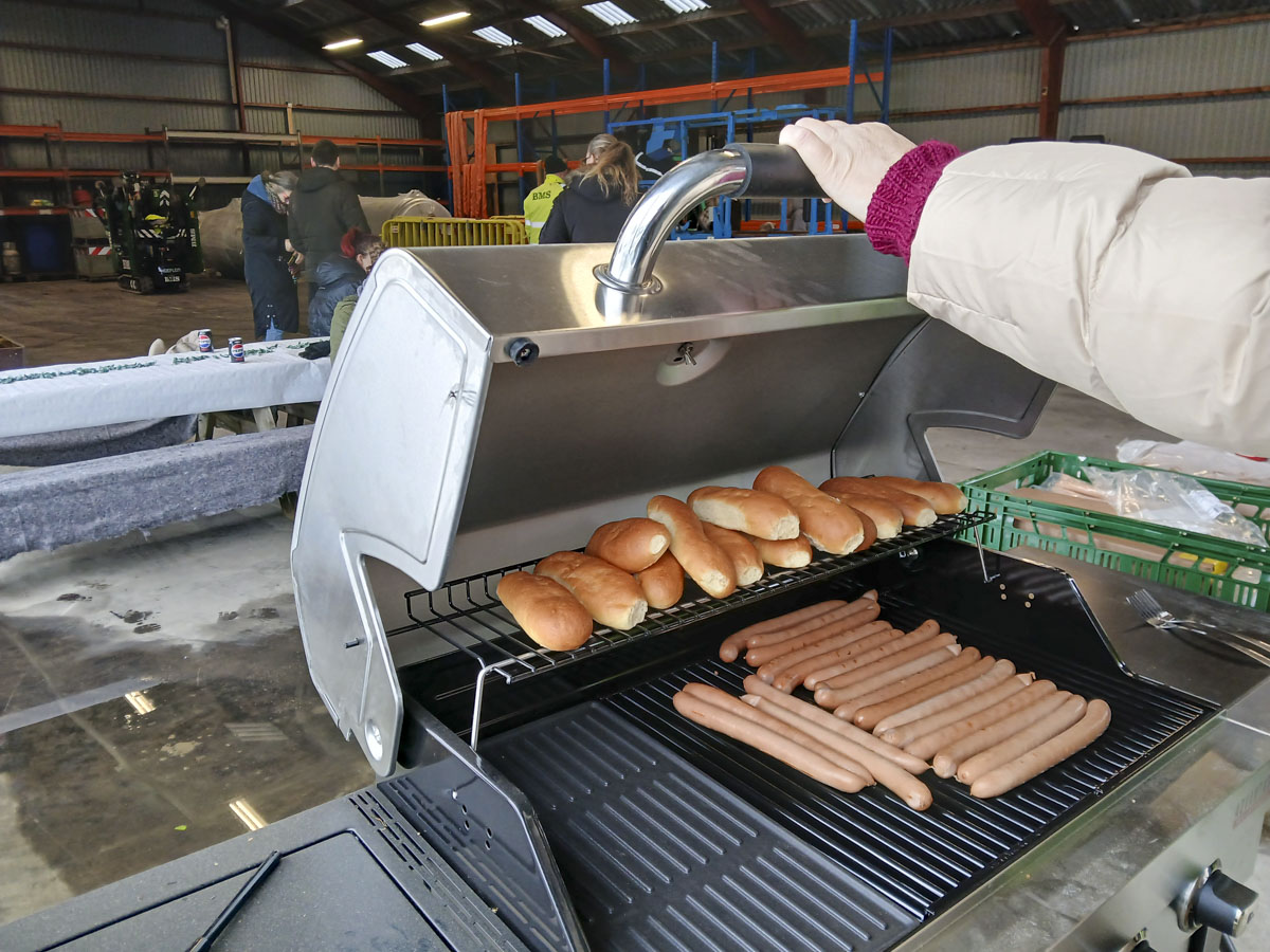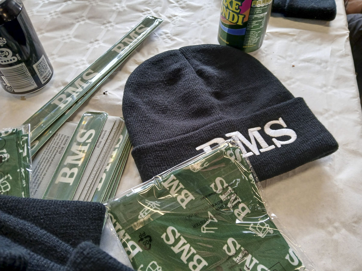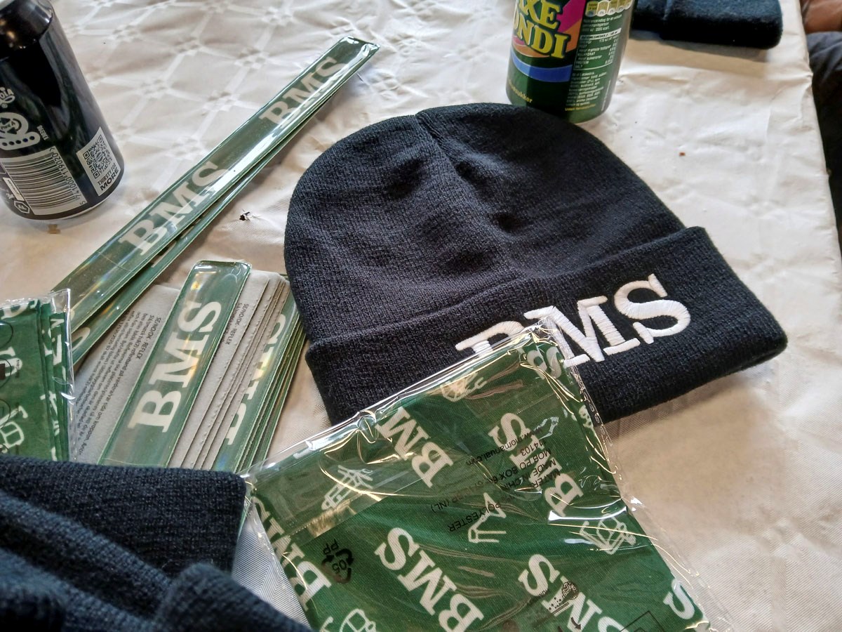 Meny Kalundborg havde doneret pølser, brød, sodavand og tilbehør, og BMS havde sørget for ekstra huer og halsedisser, så alle kunne holde varmen - og få et lille fysisk minde med hjem.