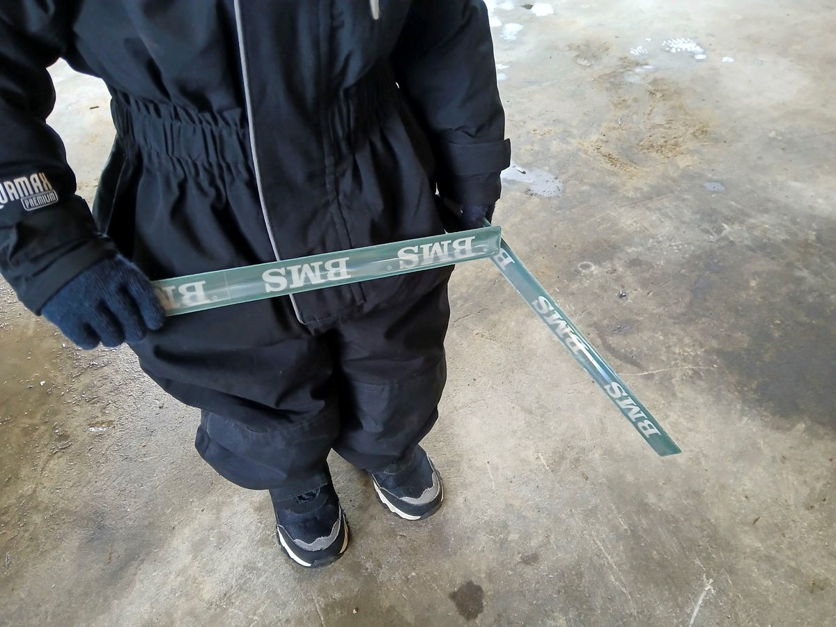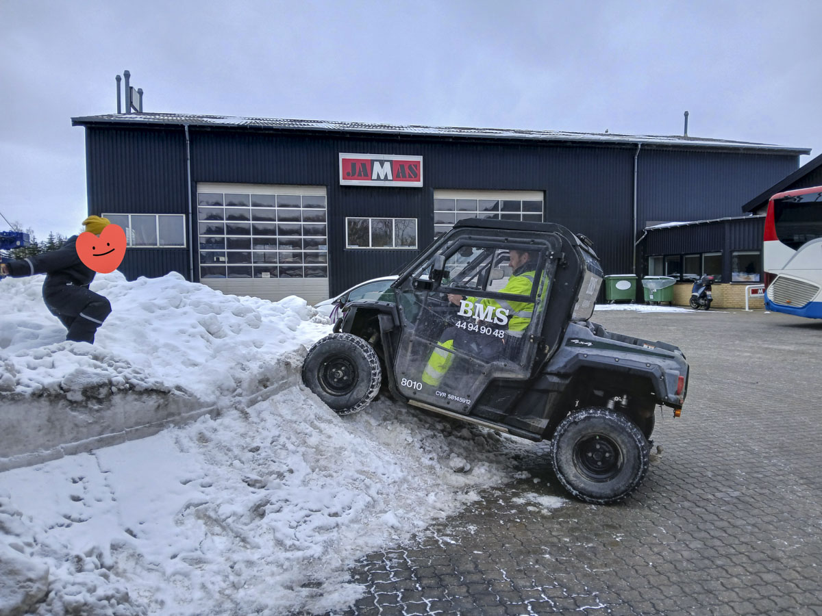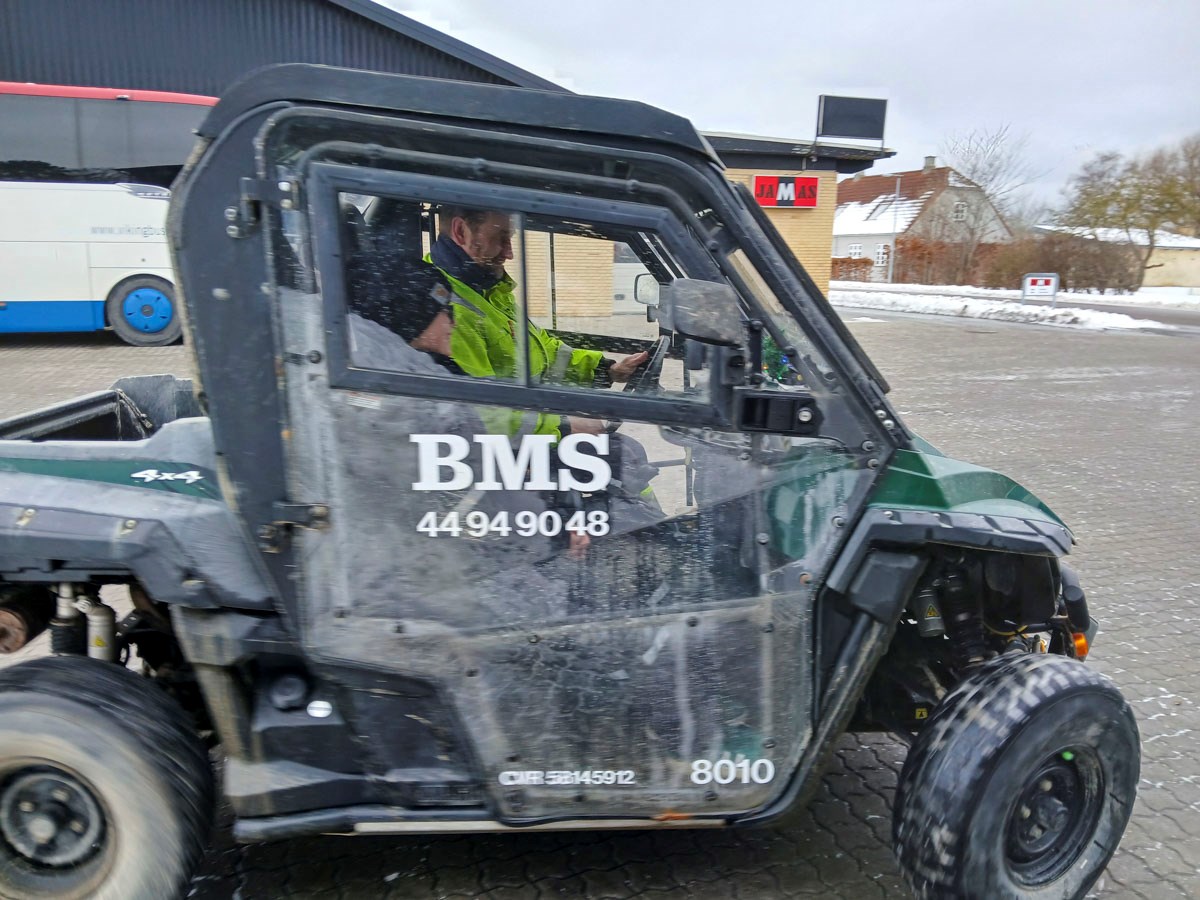 De prøvede også “skippers bil”, som hjælper medarbejderne fra BMS rundt på byggepladsen. Den var både hurtig og kunne køre op ad snedriver – til stor begejstring.