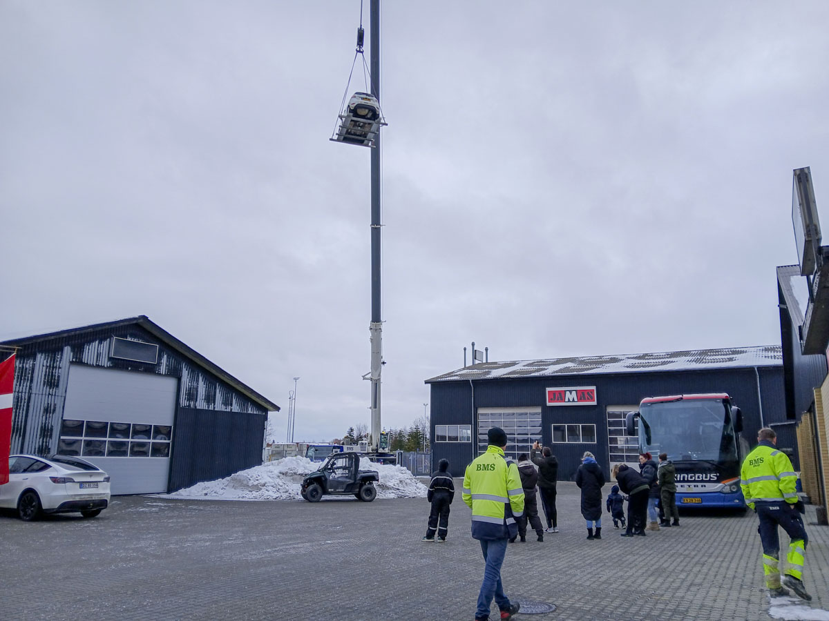 Den store kran – hele 50 meter høj, altså højere end Rundetårn – løftede en BMS-bil op i luften til stor jubel fra både børn og voksne. Heldigvis skulle ingen ind i bilen, men spændingen var stor.