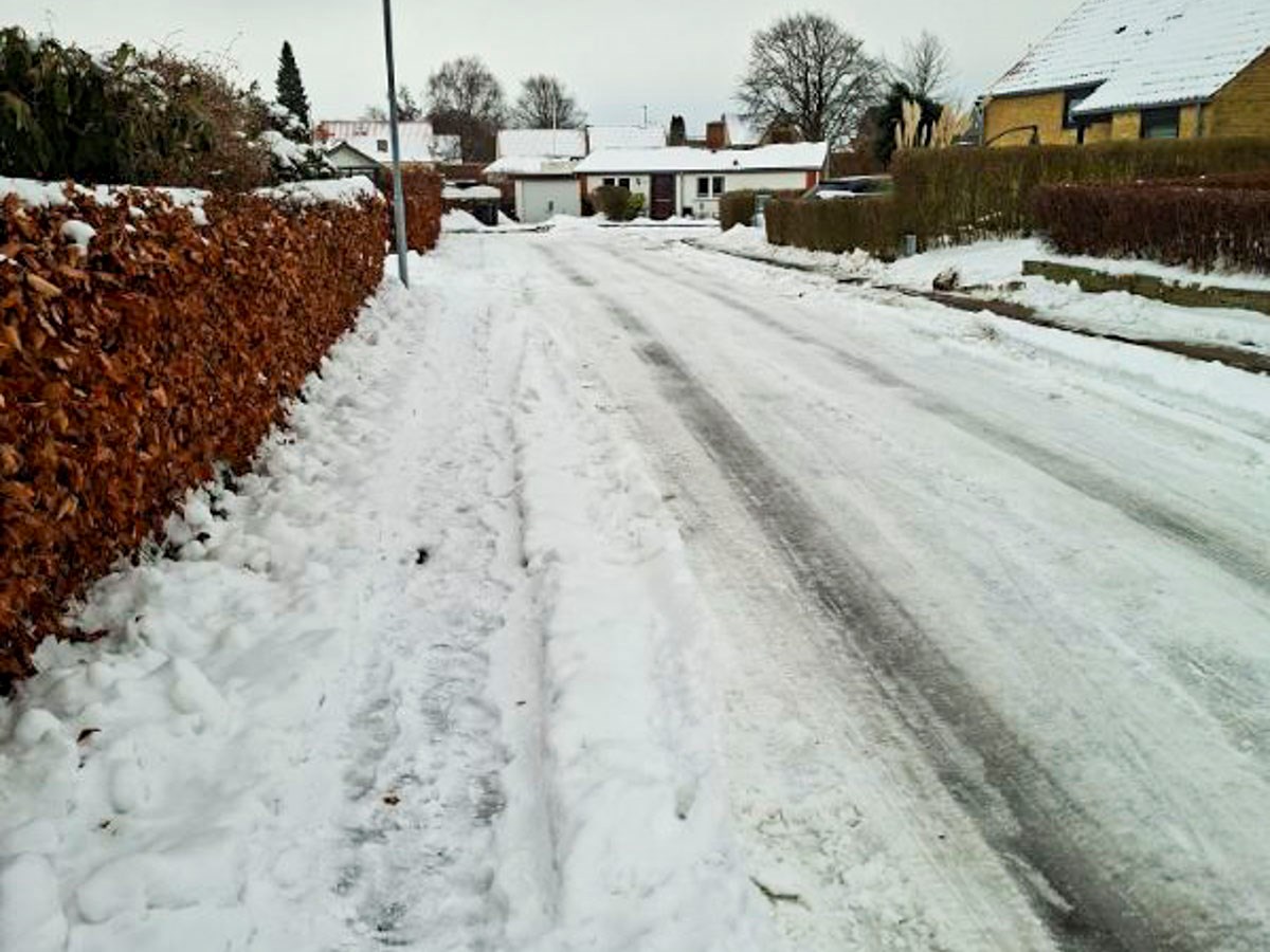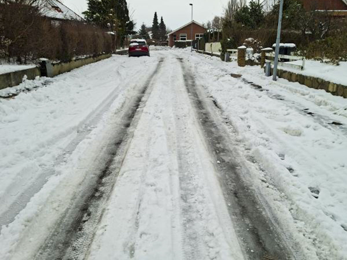 - Indgangen til din grund og vejen hen til affaldsbeholderne og postkassen er ryddet for sne i mindst en meters bredde. Hvis det er glat, skal du salte eller gruse der.