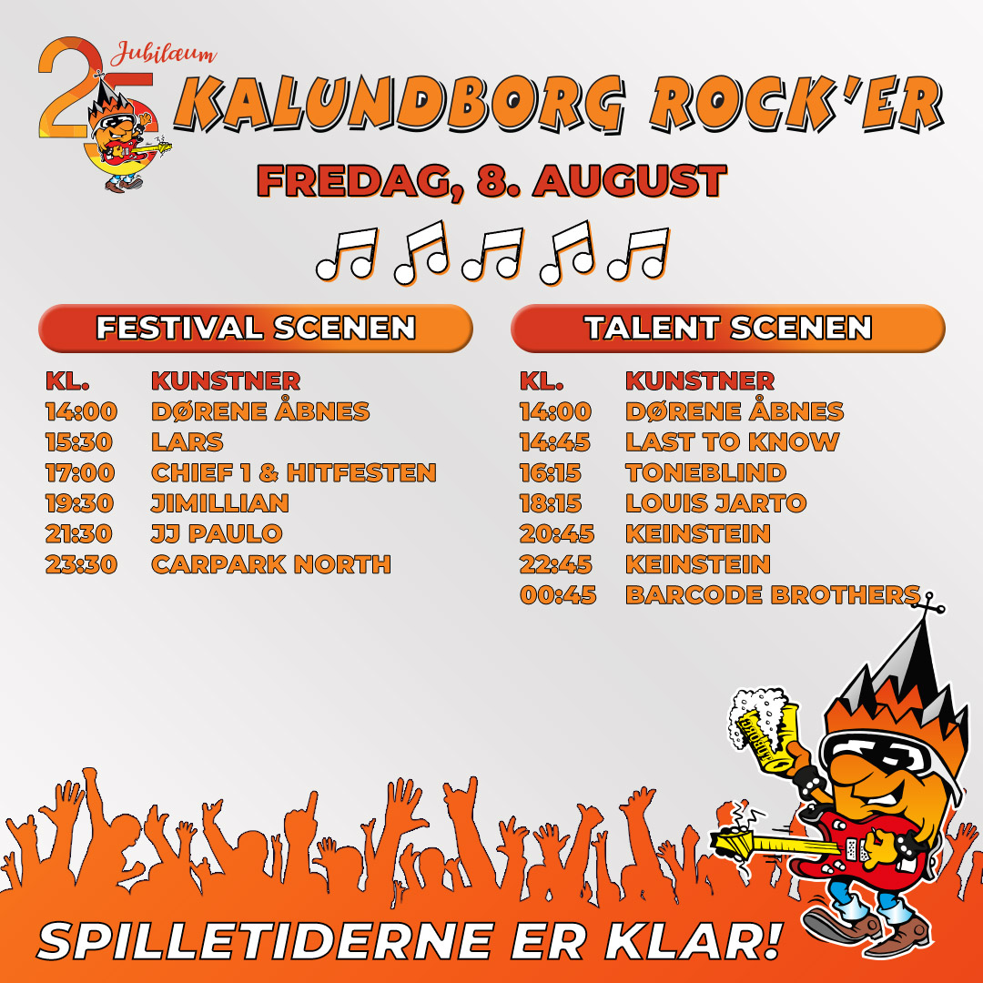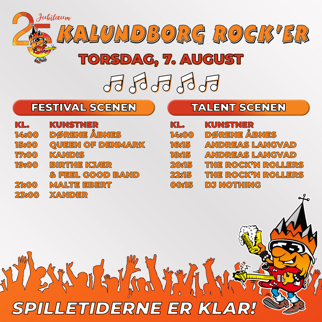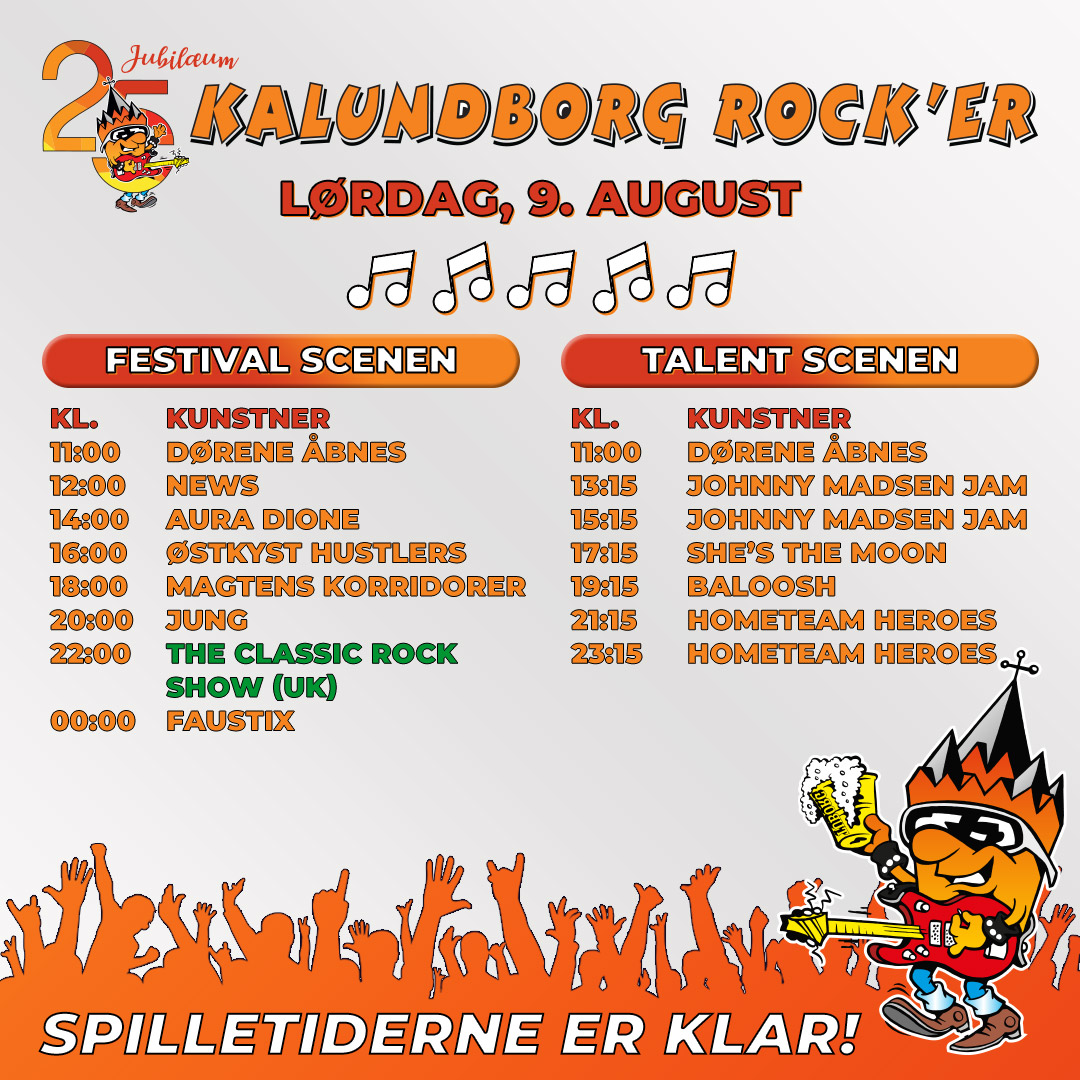 Alle navne er nu meldt ud til sommerens festival på Gisseløre i Kalundborg, og puslespillet er ligeledes gået op med hensyn til, hvornår artisterne kommer forbi scenen på Kalundborg Rock’er 2025.