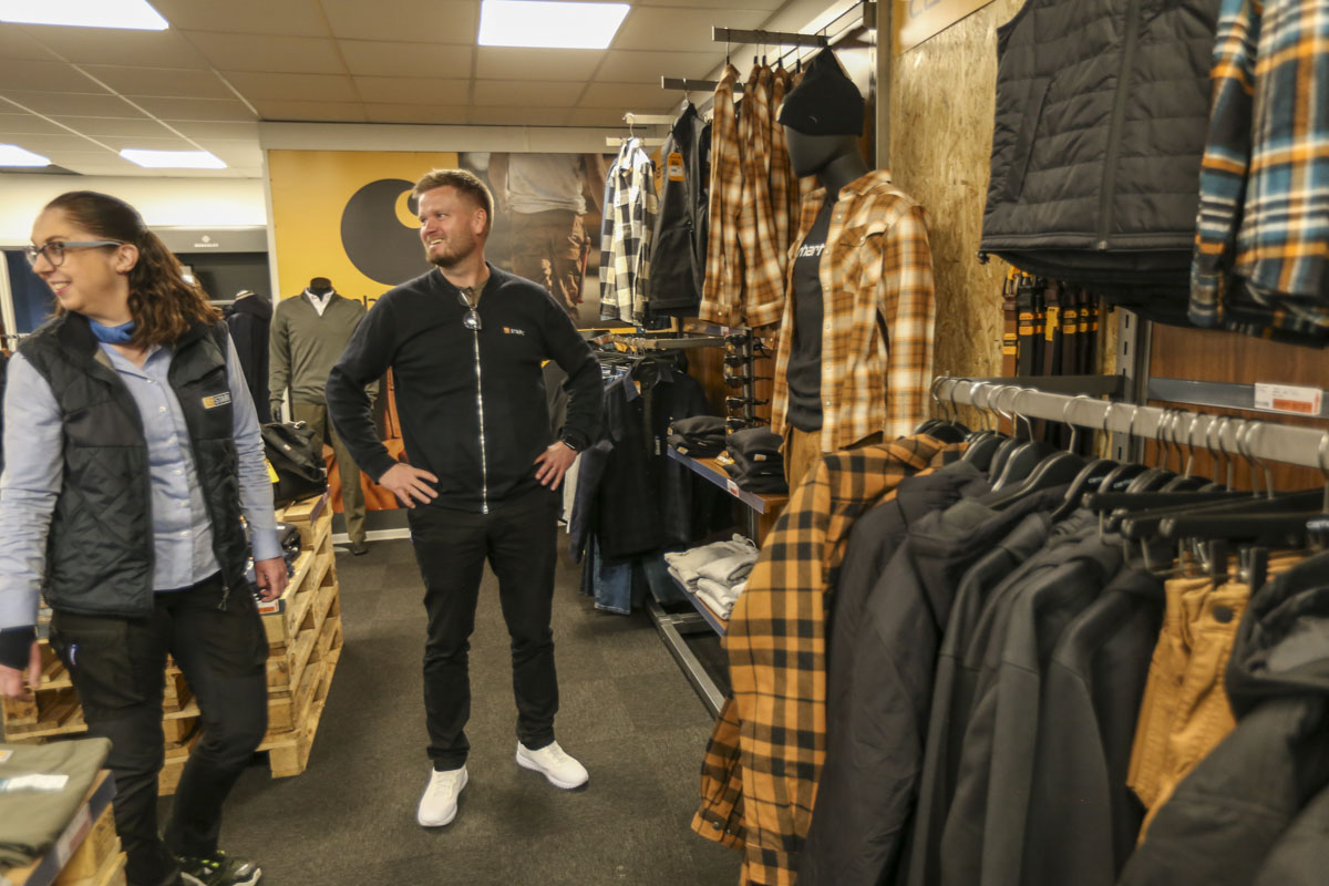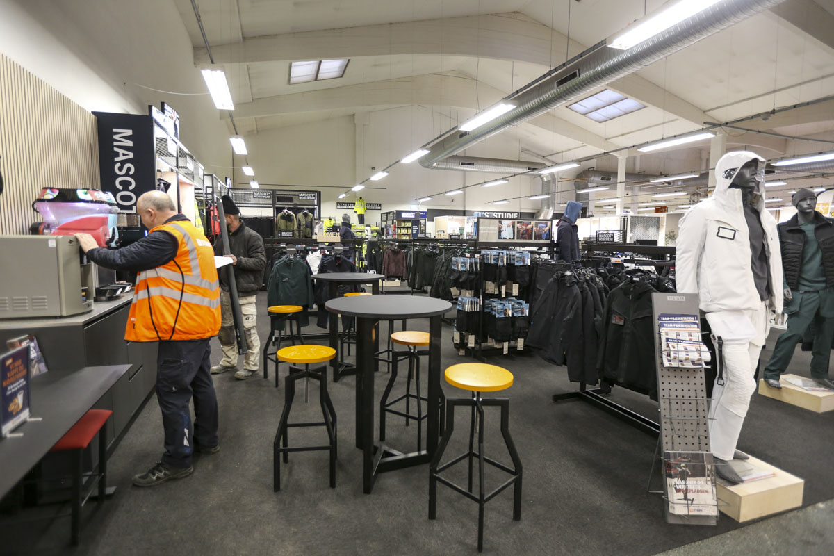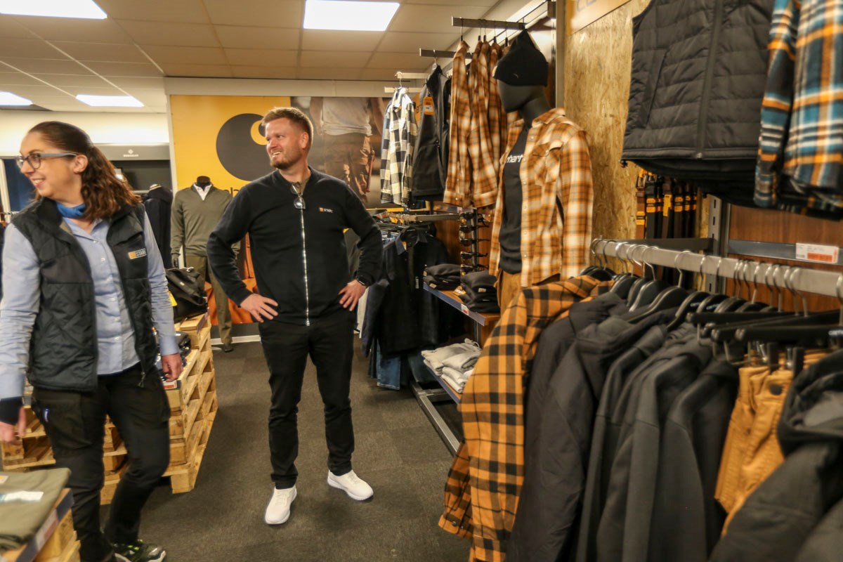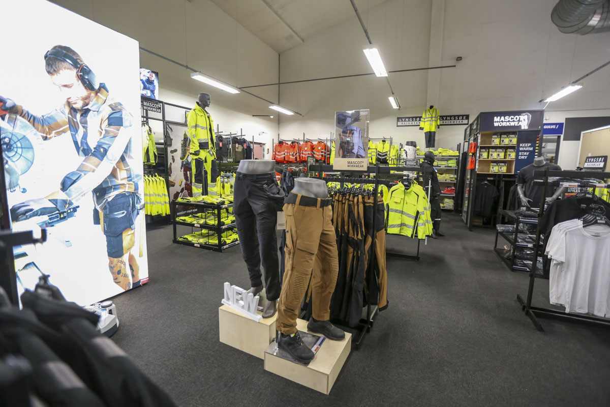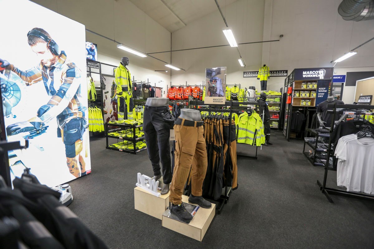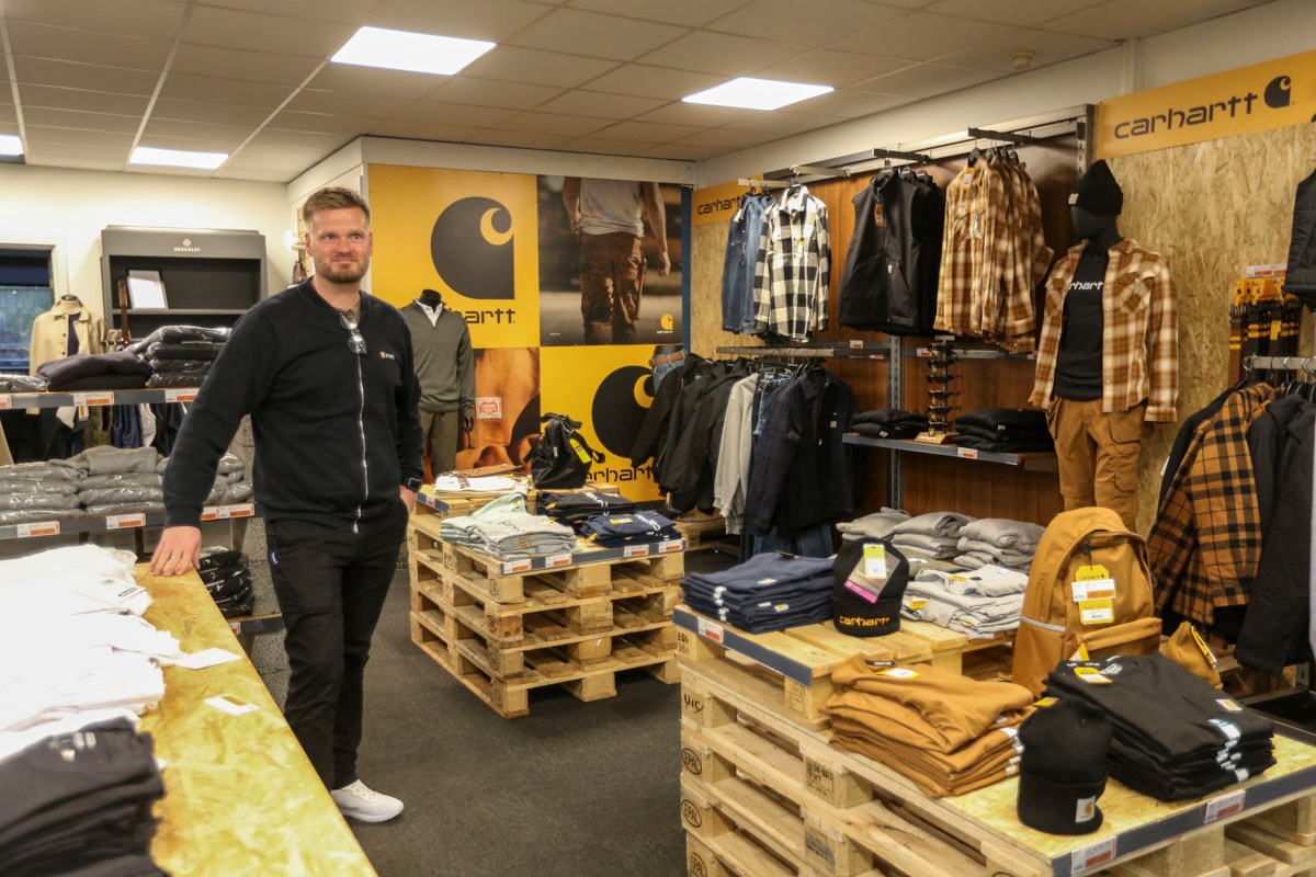 “Vi har oplevet øget interesse for profilbeklædning, og vi har den fordel, at vi har eget trykkeri, der er bemandet i hele åbningstiden. Det vil sige, at du kan komme ind, finde en trøje eller jakke og få trykt logo på. Vi tilbyder også, at man kan få broderi på sit tøj, hvis man ønsker det,” forklarer Kristian Ulrich Møbius.
