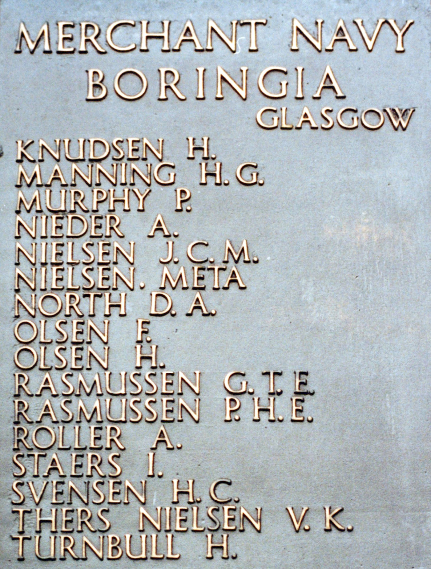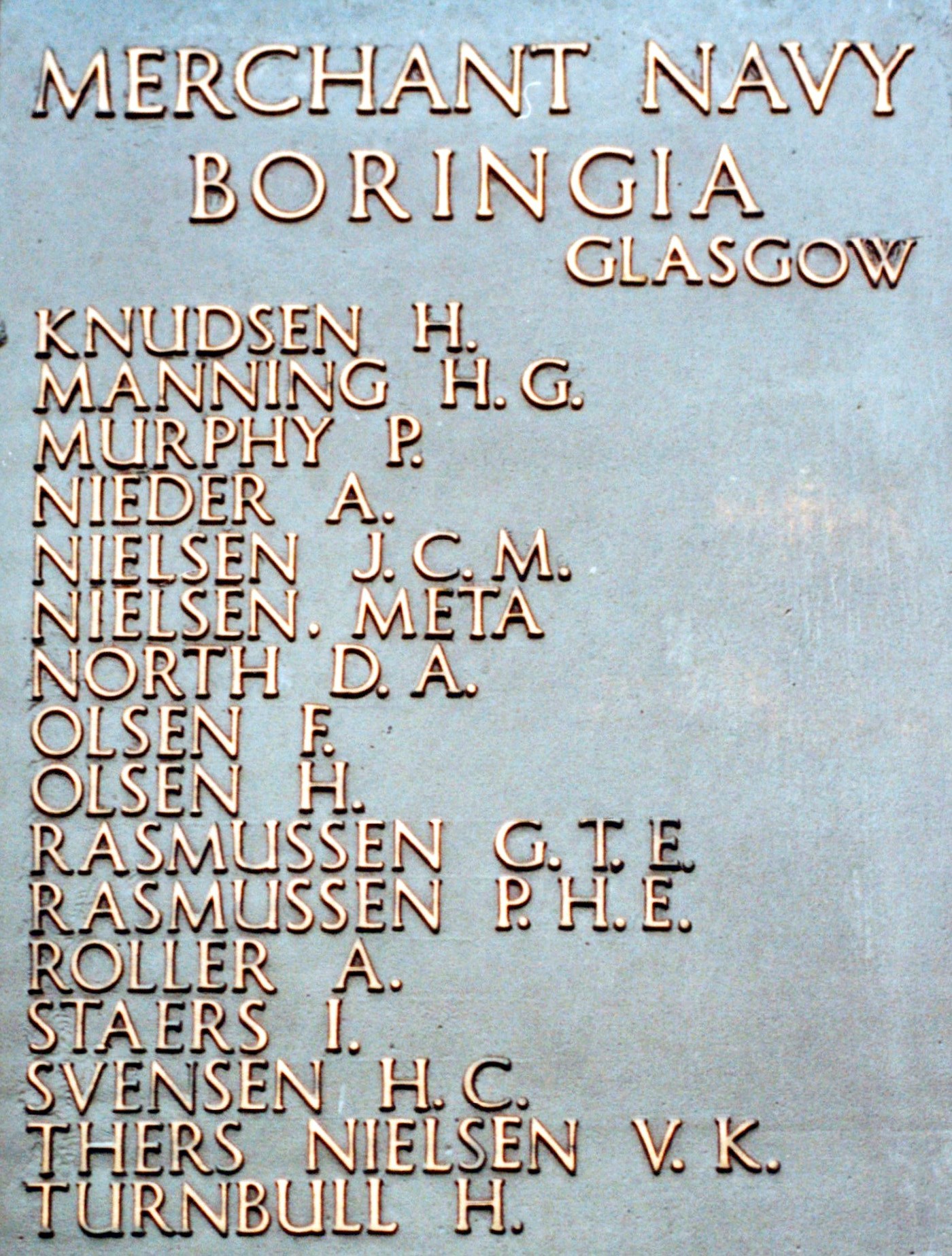 På Boringia var det steward Meta Nielsen fra Sønder Omme. Hun var gift med skibets 1. styrmand Poul Johan Frausing. Også han omkom, da redningsbåden blev sprængt i luften.