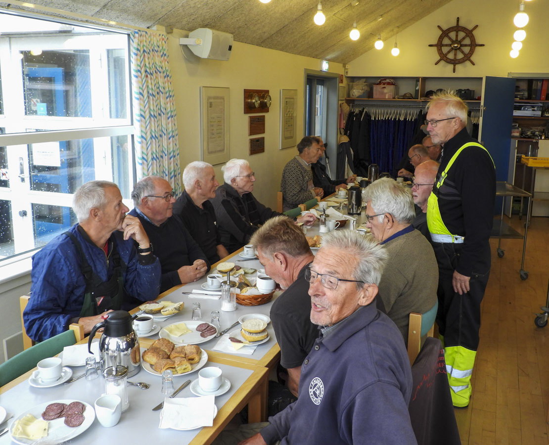 Det kan man tydeligt både se og høre, da klokken nærmer sig 10.30, for så er det nemlig kaffe og morgenbrødstid. Og måske en lille en til halsen. Det er jo koldt udenfor.