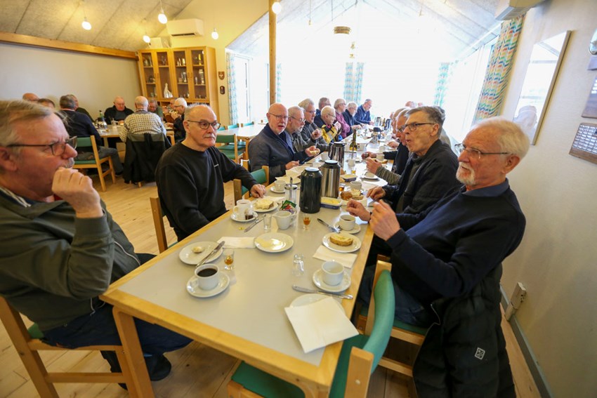 Snakken går lystigt, og 65 mænd i varme sweatre fylder godt i klubhuset.