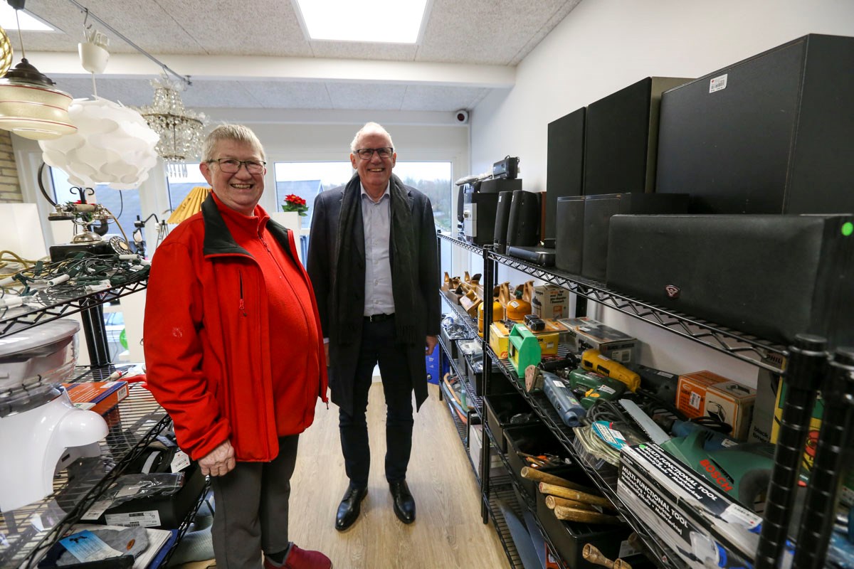 Hun havde tid til at give generalsekretær i Røde Kors, Anders Ladekarl, en hurtig rundvisning i den nye butik, før den officielle åbning klokken 10.