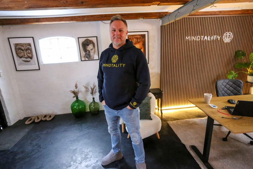 Han sidder i sit lille, hyggelige kontor på Strandhaven 6. Her har han indrettet sig med sin Mentorvirksomhed, Mindtality, hvor han både online og via 1:1 sessioner hjælper folk, både private og firmaer, til at flytte sig mentalt. Og med at udskifte negative tankemønstre med positive.