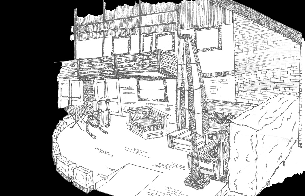 Projektet bliver i høj grad realiseret gennem frivillig indsats og lokal opbakning. Materialer genbruges i stor stil: Balkonen bliver omdannet til nye skilte, mursten anvendes til en terrasse, og paller fra lokale landmænd bliver til udendørsmøbler.